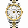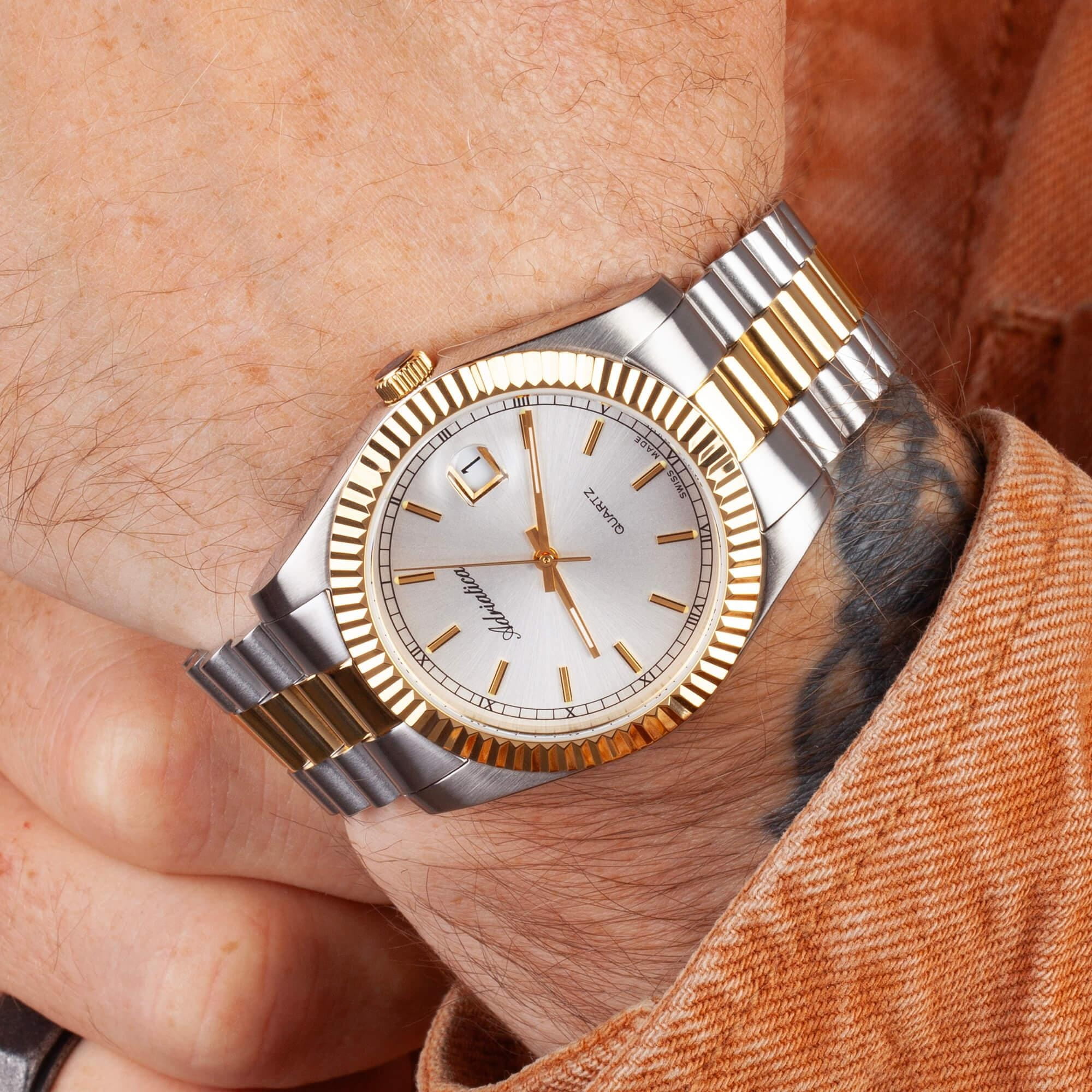 Часы Adriatica A1090.2113Q воплощают в себе классический стиль и надежность, идеально подходящие для современных мужчин. Их белый циферблат, защищенный минеральным стекломМинеральное стеклоМинеральное стекло представляет собой искусственно выращенный минерал кварца. Такое стекло отличается особой устойчивостью к повреждениям и царапинам. Уступает по некоторым качествам сапфировому стеклу., заключен в корпус из прочной нержавеющей стали, а их безельБезельВнешний ободок, закрепляющий стекло. В спортивных часах так называется поворотное кольцо с делениями на циферблате, выполняет роль таймера – замеряет отрезки времени на шкале. Неподвижный безель – элемент декора. Однонаправленно вращающийся безель на дайверских часах позволяет фиксировать моменты погружения и выныривания на поверхность. золотистого цвета с PVDPVDУльтратонкое покрытие наносится в технике вакуумного напыления, сочетает в себе нитрид титана особой прочности со слоем золота или оксида хрома. Несёт в себе декоративную или защитную функцию. покрытием. Надежный кварцевый механизм с калибром RONDA 515 обеспечивает точность, а водозащита уровня WR 50 (5 ATM) делает их устойчивыми к воздействию воды. Стальной браслет с частичным PVDPVDУльтратонкое покрытие наносится в технике вакуумного напыления, сочетает в себе нитрид титана особой прочности со слоем золота или оксида хрома. Несёт в себе декоративную или защитную функцию. покрытием и раскладной застёжкойРаскладная застёжкаТакой тип застёжки используется только на браслетах из металла. Она никогда не раскрывается полностью, происходит разделение на 2 и более частей. Раскладывающая застёжка снизит вероятность потери часов к минимуму. подчеркивает элегантный стиль и комфортно сидит на запястье. Часы оснащены функцией отображения даты в окошке в положении 3 часа, что добавляет практичности в повседневной жизни. Люминесцентное покрытиеЛюминесцентное покрытиеПозволяет считывать показания времени в темноте. Производители наносят на стрелки, часовые индексы, безель или поверхность циферблата светонакопительный состав, дающий холодное свечение. на стрелках и метках обеспечивает отличную видимость в темноте.