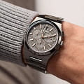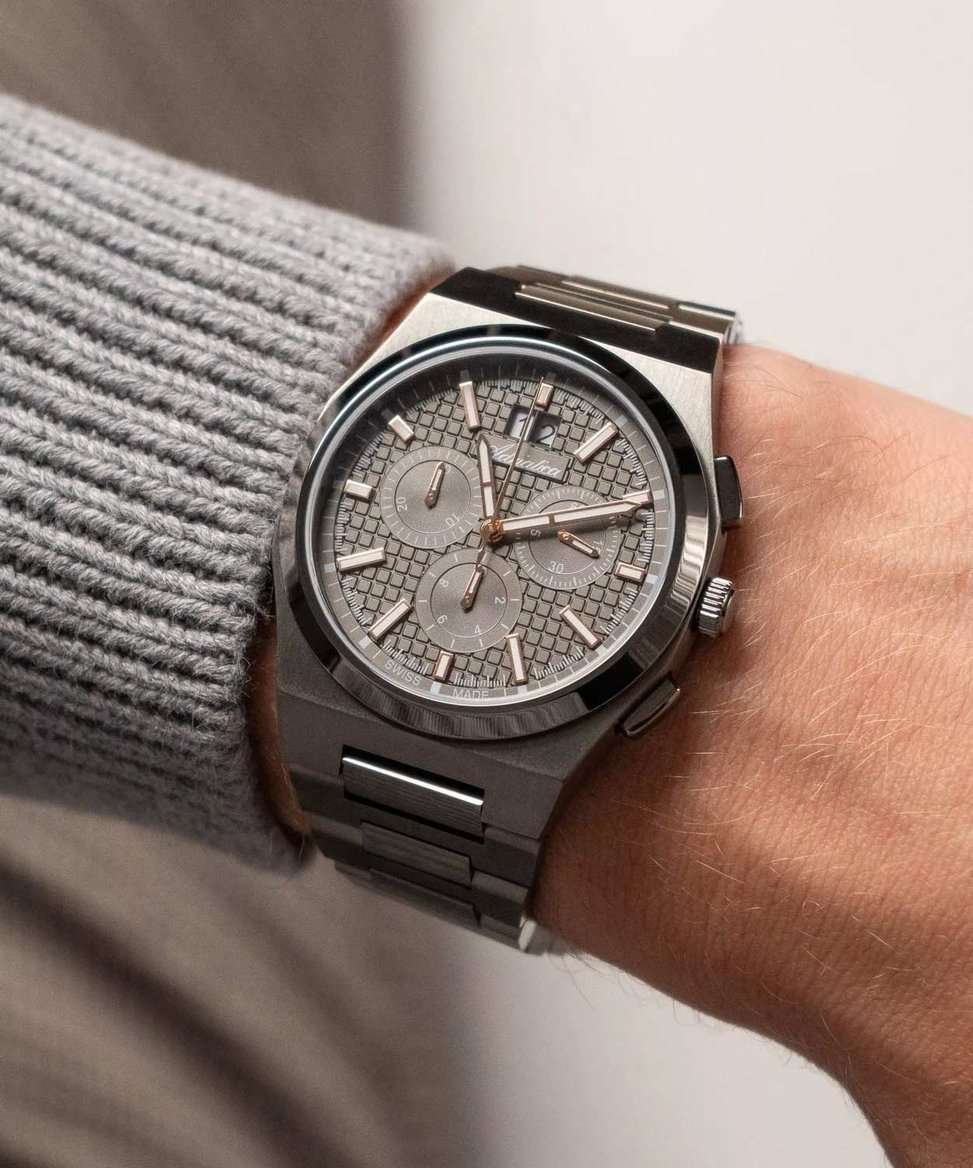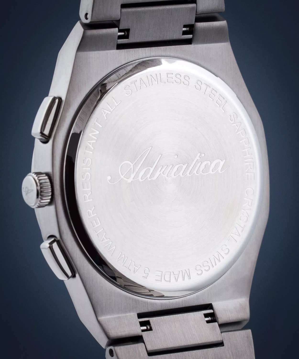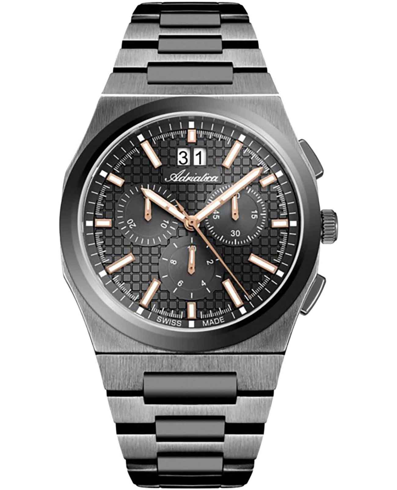 Мужские швейцарские часы-хронографХронографФункция позволяет измерять отрезки времени с особой точностью: часы, минуты, секунды. Верным признаком хронографа является наличие на циферблате 3 дополнительных окошек-счётчиков. с секундомеромСекундомерСекундоме́р — прибор, способный измерять интервалы времени с точностью до долей секунды. Adriatica Premiere A8326.S1R6CH воплощают в себе элегантность и функциональность, идеально подходящие для современных мужчин, ценящих швейцарское качество. Их черный циферблат защищенный сапфировым стекломСапфировое стеклоПрочный и надёжный материал из кристалла сапфира синтетического происхождения, характеризующийся особой твёрдостью и устойчивостью к царапинам и повреждениям., заключен в корпус и безельБезельВнешний ободок, закрепляющий стекло. В спортивных часах так называется поворотное кольцо с делениями на циферблате, выполняет роль таймера – замеряет отрезки времени на шкале. Неподвижный безель – элемент декора. Однонаправленно вращающийся безель на дайверских часах позволяет фиксировать моменты погружения и выныривания на поверхность. из нержавеющей стали с черным PVDPVDУльтратонкое покрытие наносится в технике вакуумного напыления, сочетает в себе нитрид титана особой прочности со слоем золота или оксида хрома. Несёт в себе декоративную или защитную функцию. покрытием диаметром 40 мм и толщиной 10 мм. Надежный кварцевый механизм с калибром Ronda 5040.B обеспечивает высокую точность, а водозащита 5 ATM делает часы устойчивыми к воздействию воды. Стальной браслет с черным PVDPVDУльтратонкое покрытие наносится в технике вакуумного напыления, сочетает в себе нитрид титана особой прочности со слоем золота или оксида хрома. Несёт в себе декоративную или защитную функцию. покрытием и раскладной застёжкойРаскладная застёжкаТакой тип застёжки используется только на браслетах из металла. Она никогда не раскрывается полностью, происходит разделение на 2 и более частей. Раскладывающая застёжка снизит вероятность потери часов к минимуму. обеспечивает комфортное и надежное ношение. Фактурный циферблат с метками в виде штрихов дополнен рисунком в клетку, а окошко даты находится в положении 12 часов, что добавляет практичности в повседневной жизни. Люминесцентное покрытиеЛюминесцентное покрытиеПозволяет считывать показания времени в темноте. Производители наносят на стрелки, часовые индексы, безель или поверхность циферблата светонакопительный состав, дающий холодное свечение. на стрелках и метках обеспечивает отличную видимость в темноте.