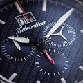 Мужские швейцарские часы-хронографХронографФункция позволяет измерять отрезки времени с особой точностью: часы, минуты, секунды. Верным признаком хронографа является наличие на циферблате 3 дополнительных окошек-счётчиков. с секундомеромСекундомерСекундоме́р — прибор, способный измерять интервалы времени с точностью до долей секунды. и  тахиметромТахиметрРазмеченная шкала, располагается на ободке или безеле часов. Тахиметр позволяет рассчитать скорость на определённом участке пути, расстояние измеряется в километрах или милях. Adriatica  Aviation A8383.4115CH воплощают в себе элегантность и функциональность, их выбирают целеустремленные мужчины, которые знают цену времени. Карбоновый синий циферблат часов, защищенный сапфировым стекломСапфировое стеклоПрочный и надёжный материал из кристалла сапфира синтетического происхождения, характеризующийся особой твёрдостью и устойчивостью к царапинам и повреждениям., заключен в корпус из титана диаметром 46 мм и толщиной 12 мм. Надежный кварцевый механизм с калибром Ronda 5040.B обеспечивает высокую точность, а водозащита 5 ATM делает часы устойчивыми к воздействию воды. Стальной браслет с раскладной застёжкойРаскладная застёжкаТакой тип застёжки используется только на браслетах из металла. Она никогда не раскрывается полностью, происходит разделение на 2 и более частей. Раскладывающая застёжка снизит вероятность потери часов к минимуму. обеспечивает комфортное и надежное ношение. Циферблат с метками в виде штрихов имеет 3 дополнительных циферблата, а также окошко даты в положении «12» , что добавляет практичности в повседневной жизни. Люминесцентное покрытиеЛюминесцентное покрытиеПозволяет считывать показания времени в темноте. Производители наносят на стрелки, часовые индексы, безель или поверхность циферблата светонакопительный состав, дающий холодное свечение. на стрелках и метках обеспечивает отличную видимость в темноте.
