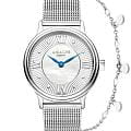 Amalys AMW-197 — женский набор, включающий часы и браслет, выполненный в гармоничном стиле. Круглый корпус диаметром 28 мм изготовлен из нержавеющей стали, а браслет типа «миланская сетка» шириной 14 мм обеспечивает комфортное прилегание и подчёркивает изящный образ. Защитную функцию выполняет сапфировое стеклоСапфировое стеклоПрочный и надёжный материал из кристалла сапфира синтетического происхождения, характеризующийся особой твёрдостью и устойчивостью к царапинам и повреждениям., устойчивое к царапинам и сохраняющее прозрачность. Механизм — кварцевый, надёжный и точный. Браслет снабжён раскладным замкомРаскладной замокДанный вариант застежки используется только на часах с металлическим браслетом. Отличительная особенность такого крепления в том, что длина браслета становится универсальной и вы можете самостоятельно отрегулировать нужный вам размер – застежка просто двигается по браслету часов., что делает ношение удобным и безопасным. Водозащита 5 ATM предохраняет модель от случайных брызг и дождя. Циферблат с римскими индексами и утончённым декоративным узором придаёт часам элегантность, а комплектный браслет завершает цельный и женственный образ.