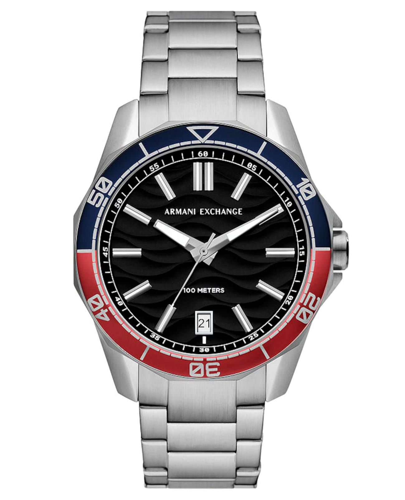 Мужские наручные часы с минеральным стекломМинеральное стеклоМинеральное стекло представляет собой искусственно выращенный минерал кварца. Такое стекло отличается особой устойчивостью к повреждениям и царапинам. Уступает по некоторым качествам сапфировому стеклу. Armani Exchange Dante AX1955, кварцевый механизм с высокой точностью. Класс водозащиты: 100 метров, позволит плавать, нырять и заниматься другими водными видами спорта. Корпус часов изготовлен из стали. Стальной браслет на раскладной застёжкеРаскладная застёжкаТакой тип застёжки используется только на браслетах из металла. Она никогда не раскрывается полностью, происходит разделение на 2 и более частей. Раскладывающая застёжка снизит вероятность потери часов к минимуму.. Вращающийся  безельБезельВнешний ободок, закрепляющий стекло. В спортивных часах так называется поворотное кольцо с делениями на циферблате, выполняет роль таймера – замеряет отрезки времени на шкале. Неподвижный безель – элемент декора. Однонаправленно вращающийся безель на дайверских часах позволяет фиксировать моменты погружения и выныривания на поверхность. с IP-покрытиемIP-покрытиеМетод ионного напыления. Демонстрирует повышенную устойчивость к истиранию, окислению и химическим веществам. Под воздействием высокого давления и температуры около 1500°C молекулы металла надёжно соединяются с частицами корпуса часов.. Текстурированный циферблат с метками в виде штрихов. Окошко даты находится в положении 6 часов.