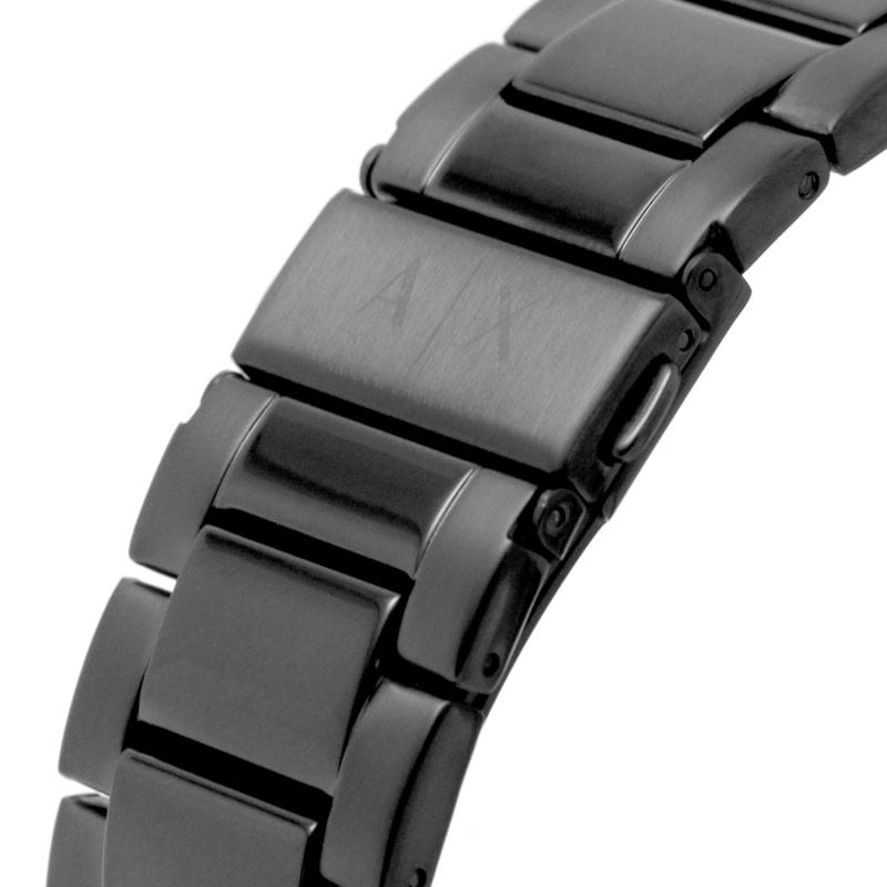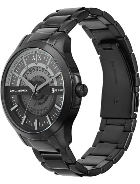 Мужские наручные часы с минеральным стекломМинеральное стеклоМинеральное стекло представляет собой искусственно выращенный минерал кварца. Такое стекло отличается особой устойчивостью к повреждениям и царапинам. Уступает по некоторым качествам сапфировому стеклу. Armani Exchange Hampton AX2444, кварцевый механизм с высокой точностью. Класс водозащиты: 50 метров, позволит защитить корпус от случайных брызг или капель дождя. Корпус и браслет часов изготовлены из стали с IP-покрытиемIP-покрытиеМетод ионного напыления. Демонстрирует повышенную устойчивость к истиранию, окислению и химическим веществам. Под воздействием высокого давления и температуры около 1500°C молекулы металла надёжно соединяются с частицами корпуса часов. черного цвета. Браслет с раскладной застёжкойРаскладная застёжкаТакой тип застёжки используется только на браслетах из металла. Она никогда не раскрывается полностью, происходит разделение на 2 и более частей. Раскладывающая застёжка снизит вероятность потери часов к минимуму.. Метки в виде штрихов. Окошко даты в положении 3 часа.