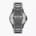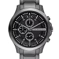 Мужские наручные часы-хронографХронографФункция позволяет измерять отрезки времени с особой точностью: часы, минуты, секунды. Верным признаком хронографа является наличие на циферблате 3 дополнительных окошек-счётчиков. с минеральным стекломМинеральное стеклоМинеральное стекло представляет собой искусственно выращенный минерал кварца. Такое стекло отличается особой устойчивостью к повреждениям и царапинам. Уступает по некоторым качествам сапфировому стеклу. Armani Exchange Hampton AX2454, кварцевый механизм с высокой точностью. Класс водозащиты: 50 метров, позволит защитить корпус от случайных брызг или капель дождя. Корпус часов изготовлен из нержавеющей стали с PVD-покрытиемPVDУльтратонкое покрытие наносится в технике вакуумного напыления, сочетает в себе нитрид титана особой прочности со слоем золота или оксида хрома. Несёт в себе декоративную или защитную функцию.. Стальной браслет с PVD-покрытиемPVDУльтратонкое покрытие наносится в технике вакуумного напыления, сочетает в себе нитрид титана особой прочности со слоем золота или оксида хрома. Несёт в себе декоративную или защитную функцию. с раскладной застёжкойРаскладная застёжкаТакой тип застёжки используется только на браслетах из металла. Она никогда не раскрывается полностью, происходит разделение на 2 и более частей. Раскладывающая застёжка снизит вероятность потери часов к минимуму.. Метки в виде штрихов.