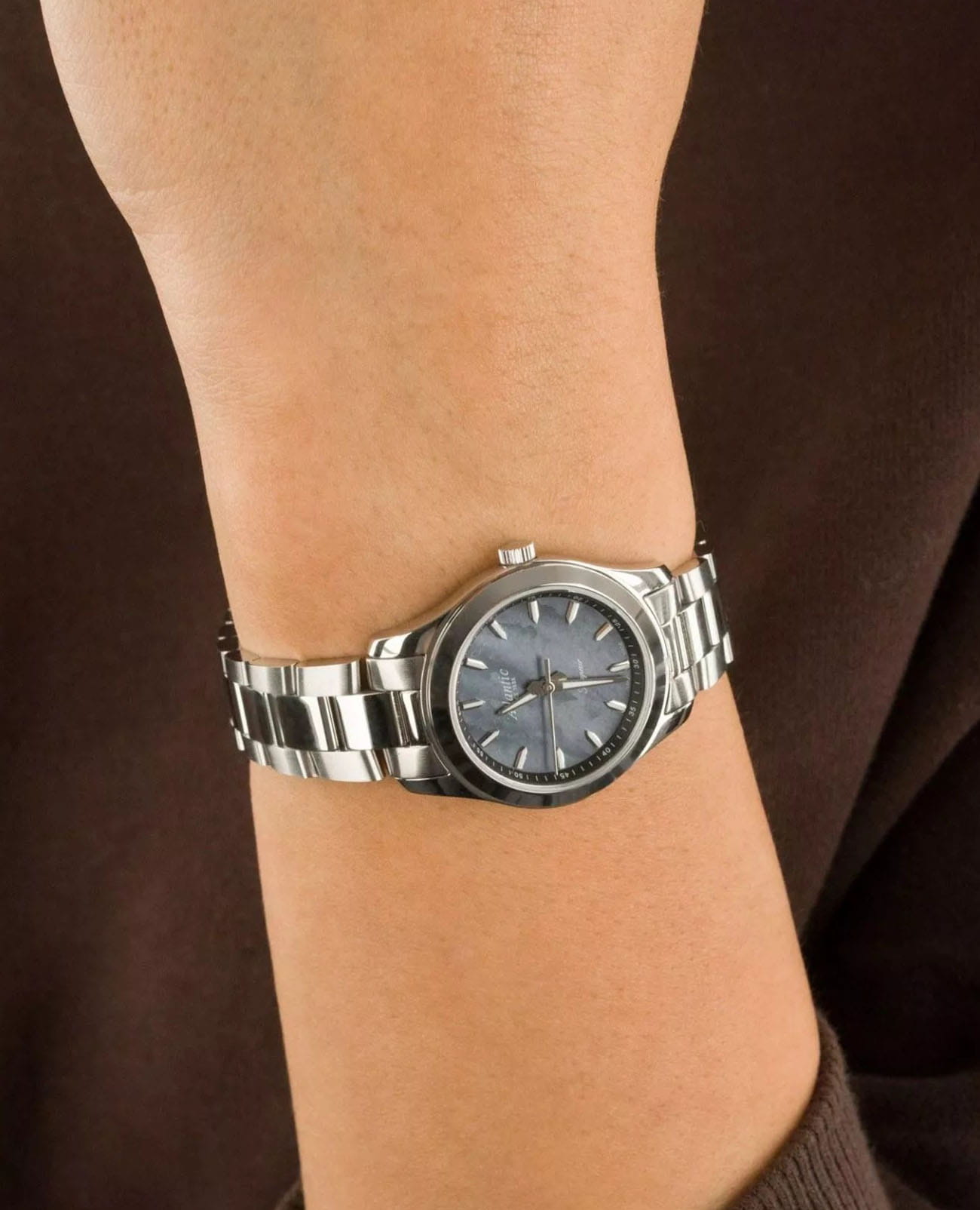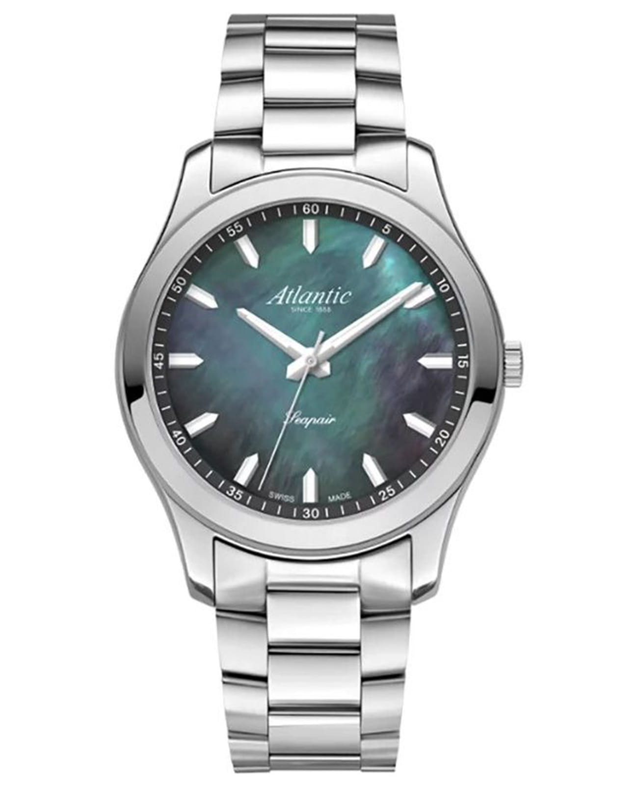 Женские швейцарские часы Atlantic Seapair Ladies 20335.41.01BK, кварцевый механизм с высокой точностью. Циферблат часов цвета морской волны с перламутровым отливом с люминесцентным покрытиемЛюминесцентное покрытиеПозволяет считывать показания времени в темноте. Производители наносят на стрелки, часовые индексы, безель или поверхность циферблата светонакопительный состав, дающий холодное свечение. стрелок и меток, дополнен сапфировым стекломСапфировое стеклоПрочный и надёжный материал из кристалла сапфира синтетического происхождения, характеризующийся особой твёрдостью и устойчивостью к царапинам и повреждениям., устойчивым к появлению царапин и обладающее высокой прозрачностью. Класс водозащиты: 30 метров, позволит защитить корпус от случайных брызг или капель дождя. Корпус часов изготовлен из нержавеющей стали. Стальной браслет с раскладной застёжкойРаскладная застёжкаТакой тип застёжки используется только на браслетах из металла. Она никогда не раскрывается полностью, происходит разделение на 2 и более частей. Раскладывающая застёжка снизит вероятность потери часов к минимуму..