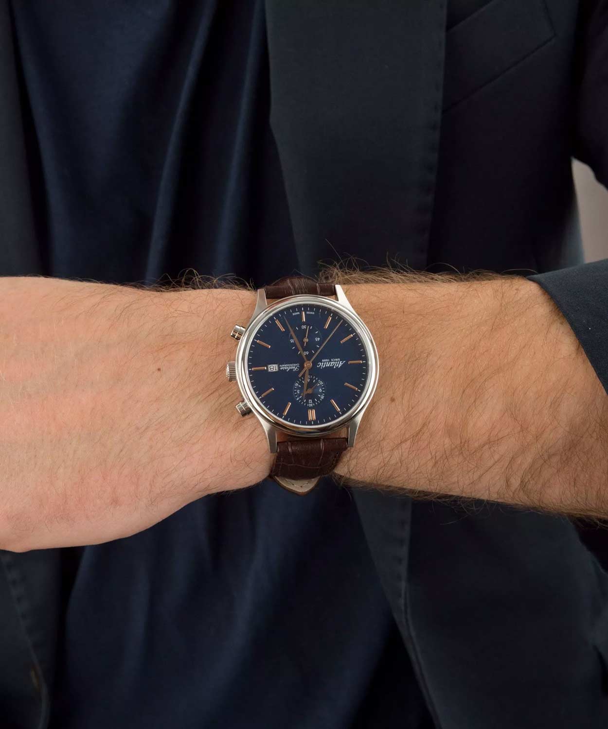 Мужские кварцевые швейцарские часы Atlantic Seabase Quartz Chronograph Edition c хронографомХронографФункция позволяет измерять отрезки времени с особой точностью: часы, минуты, секунды. Верным признаком хронографа является наличие на циферблате 3 дополнительных окошек-счётчиков. 64452.41.51R, механизм с высокой точностью. Циферблат часов с сапфировым стекломСапфировое стеклоПрочный и надёжный материал из кристалла сапфира синтетического происхождения, характеризующийся особой твёрдостью и устойчивостью к царапинам и повреждениям., устойчивым к появлению царапин и обладающее высокой прозрачностью. Класс водозащиты: 50 метров, позволит защитить корпус от случайных брызг или капель дождя. Корпус часов изготовлен из нержавеющей стали. Кожаный ремешок на стандартной застёжке. Окошко даты находится в положении 3 часа.