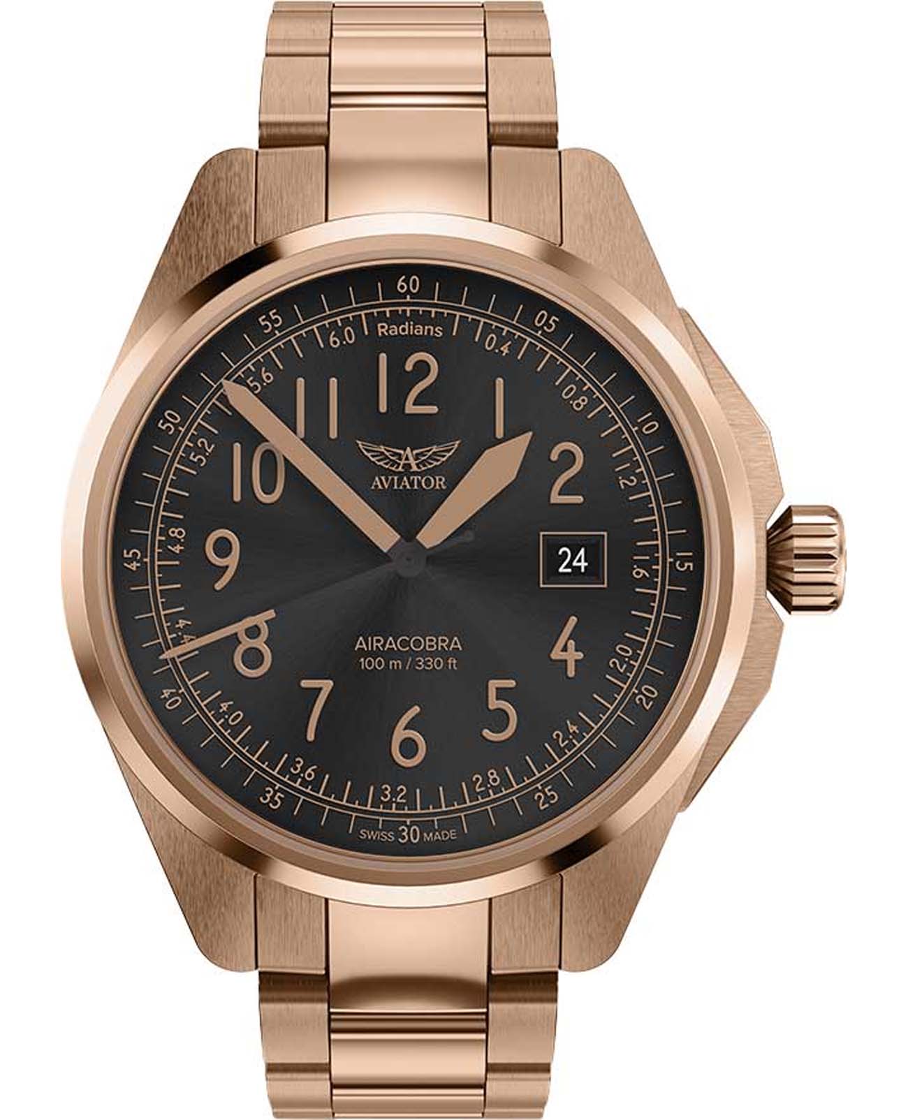 Aviator V.1.38.2.323.5 “Airacobra 43 Type A” — надёжные швейцарские пилотские часы с насыщенным функционалом и строгим авиационным дизайном. Корпус диаметром 42,8 мм выполнен из нержавеющей стали с PVD-покрытиемPVDУльтратонкое покрытие наносится в технике вакуумного напыления, сочетает в себе нитрид титана особой прочности со слоем золота или оксида хрома. Несёт в себе декоративную или защитную функцию..
