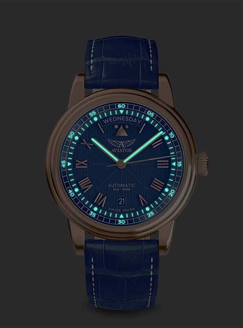 Aviator Douglas Day Date V.3.35.2.277.4 — швейцарские часы в классике авиадизайна, сочетающие безупречную читаемость и высокую надёжность. Лимитированная серия – 950 экземпляров. Корпус диаметром 41,2 мм выполнен из нержавеющей стали 316L с PVD-покрытиемPVDУльтратонкое покрытие наносится в технике вакуумного напыления, сочетает в себе нитрид титана особой прочности со слоем золота или оксида хрома. Несёт в себе декоративную или защитную функцию. цвета розового золота. Накладные метки выполнены в виде римских цифр. Окошко даты находится в положении 6 часов. День недели находится в положении 12 часов. Часовые метки и стрелки покрыты люминесцентным покрытиемЛюминесцентное покрытиеПозволяет считывать показания времени в темноте. Производители наносят на стрелки, часовые индексы, безель или поверхность циферблата светонакопительный состав, дающий холодное свечение. Superluminova, позволяющим легко определять время даже в тёмное время суток. Поверхность защищена прочным сапфировым стекломСапфировое стеклоПрочный и надёжный материал из кристалла сапфира синтетического происхождения, характеризующийся особой твёрдостью и устойчивостью к царапинам и повреждениям. с антибликовым покрытием, устойчивым к царапинам. Сердце модели — швейцарский механизм Sellita SW 240-1, известный своей точностью и долговечностью. Водозащита 100 метров, позволит плавать, нырять и заниматься другими водными видами спорта. Завинчивающаяся головка и задняя крышка обеспечивают уверенную ударопрочностьУдаропрочный корпусМеханизм заключён в корпус, выполненный из современных материалов, устойчивых к ударам, механическим повреждениям и падению с высоты: инновационный пластик, карбон, нержавеющая сталь, титан. и надёжную защиту от влаги и пыли. В механизме 26 камней, запас хода до 41 час. Модель дополнена кожаным ремешком с выразительной текстурой и классическим стилем, закреплённым с помощью застёжке-бабочке с кнопкамиЗастёжка "бабочка"Такой вид застёжки дополняется предохранителями, помогающими избежать случайного раскрытия браслета. Обладают изящным исполнением. — для максимального комфорта и лёгкости в повседневном использовании. Модель вдохновлена американским пассажирским самолетом Douglas DC-3, который является одним из лучших самолетов за всю историю авиации. Aviator — это образец лётной точности, инженерной чёткости и сдержанной роскоши, идеально подходящий для тех, кто ценит функциональность и уверенность в каждом элементе.