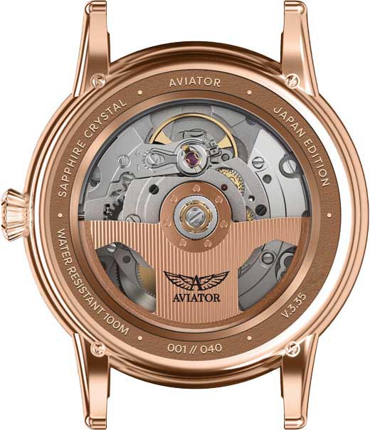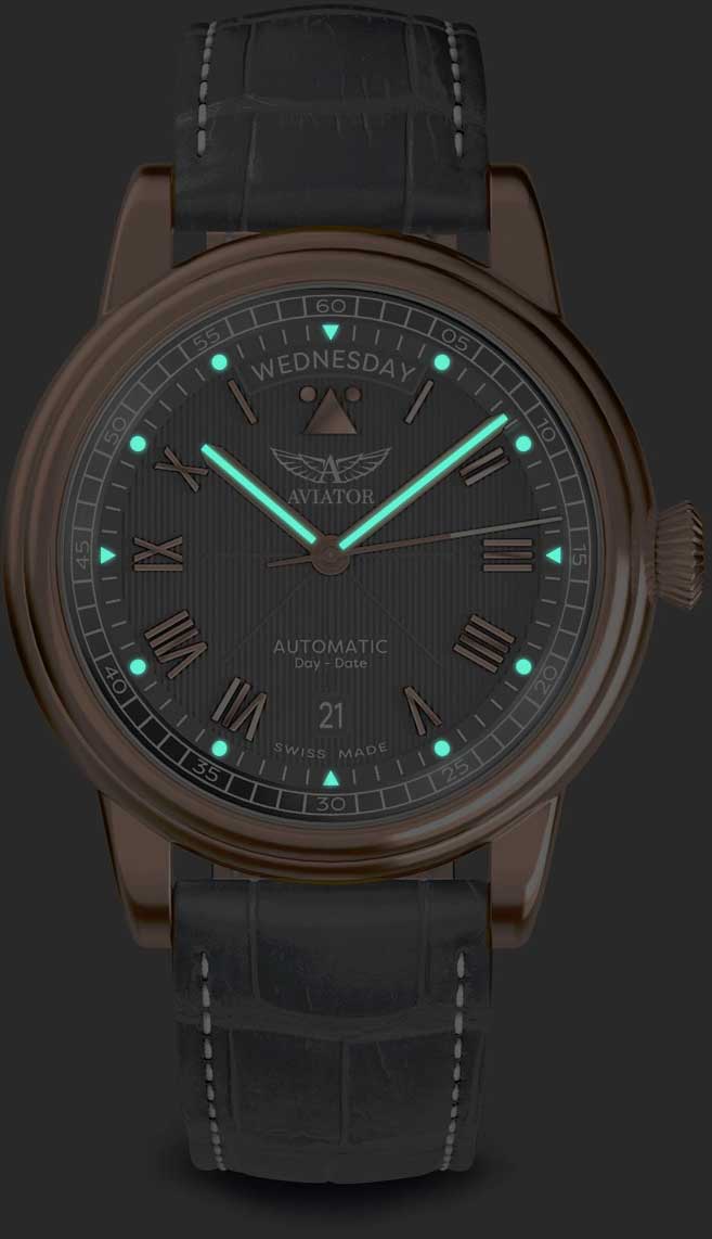 Aviator Douglas Day Date V.3.35.2.283.4 — швейцарские часы в классике авиадизайна, сочетающие безупречную читаемость и высокую надёжность. Лимитированная серия - 40 экземпляров. Корпус диаметром 41,2 мм выполнен из нержавеющей стали 316L с PVD-покрытиемPVDУльтратонкое покрытие наносится в технике вакуумного напыления, сочетает в себе нитрид титана особой прочности со слоем золота или оксида хрома. Несёт в себе декоративную или защитную функцию. цвета розового золота. Накладные метки выполнены в виде римских цифр. Окошко даты находится в положении 6 часов. День недели находится в положении 12 часов. Часовые метки и стрелки покрыты люминесцентным покрытиемЛюминесцентное покрытиеПозволяет считывать показания времени в темноте. Производители наносят на стрелки, часовые индексы, безель или поверхность циферблата светонакопительный состав, дающий холодное свечение. Superluminova, позволяющим легко определять время даже в тёмное время суток. Поверхность защищена прочным сапфировым стекломСапфировое стеклоПрочный и надёжный материал из кристалла сапфира синтетического происхождения, характеризующийся особой твёрдостью и устойчивостью к царапинам и повреждениям. с антибликовым покрытием, устойчивым к царапинам. Сердце модели — швейцарский механизм Sellita SW 240-2, известный своей точностью и долговечностью. Водозащита 100 метров, позволит плавать, нырять и заниматься другими водными видами спорта. Завинчивающаяся головка и задняя крышка обеспечивают уверенную ударопрочностьУдаропрочный корпусМеханизм заключён в корпус, выполненный из современных материалов, устойчивых к ударам, механическим повреждениям и падению с высоты: инновационный пластик, карбон, нержавеющая сталь, титан. и надёжную защиту от влаги и пыли. В механизме 26 камней, запас хода до 41 час. Модель дополнена кожаным ремешком с выразительной текстурой и классическим стилем, закреплённым с помощью застёжке-бабочке с кнопкамиЗастёжка "бабочка"Такой вид застёжки дополняется предохранителями, помогающими избежать случайного раскрытия браслета. Обладают изящным исполнением. — для максимального комфорта и лёгкости в повседневном использовании. Модель вдохновлена американским пассажирским самолетом Douglas DC-3, который является одним из лучших самолетов за всю историю авиации. Aviator — это образец лётной точности, инженерной чёткости и сдержанной роскоши, идеально подходящий для тех, кто ценит функциональность и уверенность в каждом элементе.