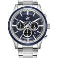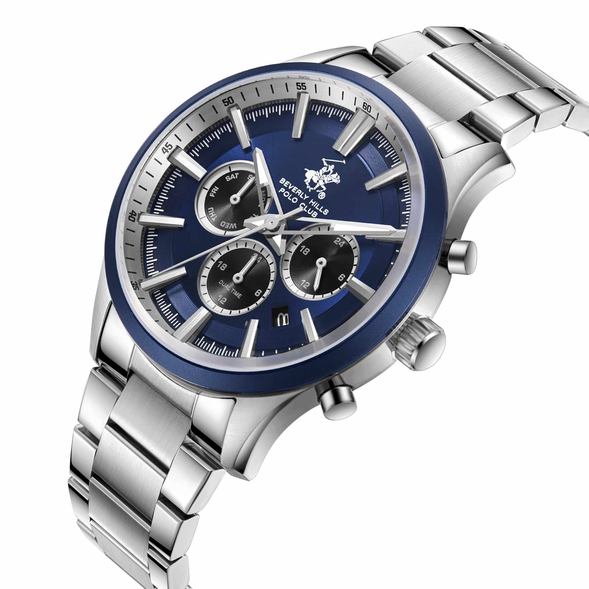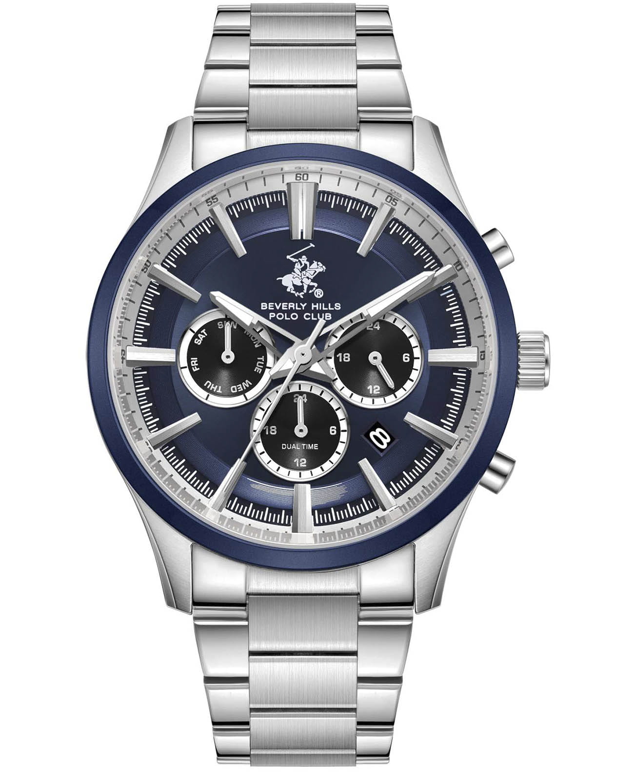 Мужские кварцевые часы Beverly Hills Polo Club — это воплощение лаконичности и эффектного стиля. Корпус диаметром 42 мм выполнен из нержавеющей стали. БезельБезельВнешний ободок, закрепляющий стекло. В спортивных часах так называется поворотное кольцо с делениями на циферблате, выполняет роль таймера – замеряет отрезки времени на шкале. Неподвижный безель – элемент декора. Однонаправленно вращающийся безель на дайверских часах позволяет фиксировать моменты погружения и выныривания на поверхность. из нержавеющей стали с IP-покрытиемIP-покрытиеМетод ионного напыления. Демонстрирует повышенную устойчивость к истиранию, окислению и химическим веществам. Под воздействием высокого давления и температуры около 1500°C молекулы металла надёжно соединяются с частицами корпуса часов.. Циферблат синего цвета оформлен штрихами, стрелками и тремя вынесенными субциферблатами: для отображения дня недели, даты и 24-часового формата времени. Стрелки с люминесцентным покрытиемЛюминесцентное покрытиеПозволяет считывать показания времени в темноте. Производители наносят на стрелки, часовые индексы, безель или поверхность циферблата светонакопительный состав, дающий холодное свечение., обеспечивающим хорошую читаемость в темноте. Циферблат защищён минеральным стекломМинеральное стеклоМинеральное стекло представляет собой искусственно выращенный минерал кварца. Такое стекло отличается особой устойчивостью к повреждениям и царапинам. Уступает по некоторым качествам сапфировому стеклу. с сапфировым покрытием. Часы оснащены браслетом из нержавеющей стали на раскладной застёжкеРаскладная застёжкаТакой тип застёжки используется только на браслетах из металла. Она никогда не раскрывается полностью, происходит разделение на 2 и более частей. Раскладывающая застёжка снизит вероятность потери часов к минимуму.. Водонепроницаемость 50 м позволяет использовать часы при мытье рук или в дождь. Идеальный выбор для тех, кто ценит американское качество и универсальный дизайн.