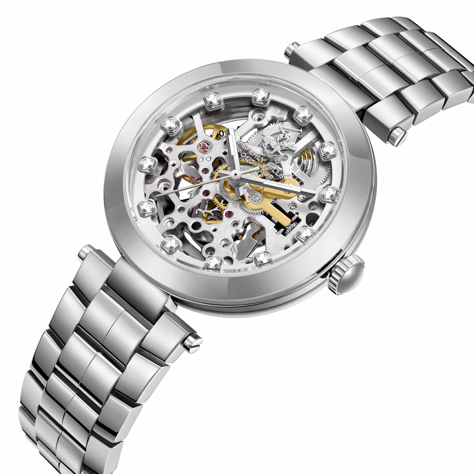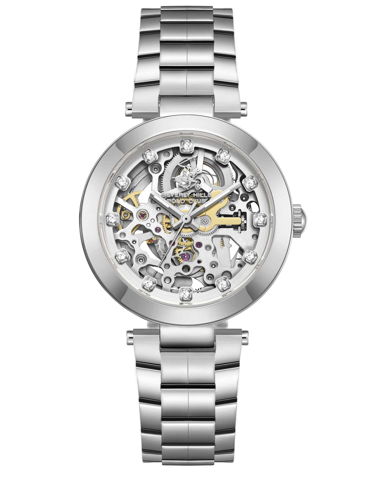 Женские механические часы с автоподзаводом Beverly Hills Polo Club — это изысканный аксессуар для современной леди. Корпус диаметром 35 мм выполнен из стали 316L. Циферблат серебристого цвета частично скелетонизированный, оформлен точками, инкрустированными цирконами, и стрелками. Циферблат защищён минеральным стекломМинеральное стеклоМинеральное стекло представляет собой искусственно выращенный минерал кварца. Такое стекло отличается особой устойчивостью к повреждениям и царапинам. Уступает по некоторым качествам сапфировому стеклу. с сапфировым покрытием. Заводная головка завинчивающаяся, что повышает надёжность. Часы оснащены стальным браслетом на застёжке «бабочка» с кнопкамиЗастёжка "бабочка"Такой вид застёжки дополняется предохранителями, помогающими избежать случайного раскрытия браслета. Обладают изящным исполнением. . Водонепроницаемость 30 м позволяет использовать часы в повседневных условиях. Идеальный выбор для тех, кто ценит американское качество и универсальный дизайн.