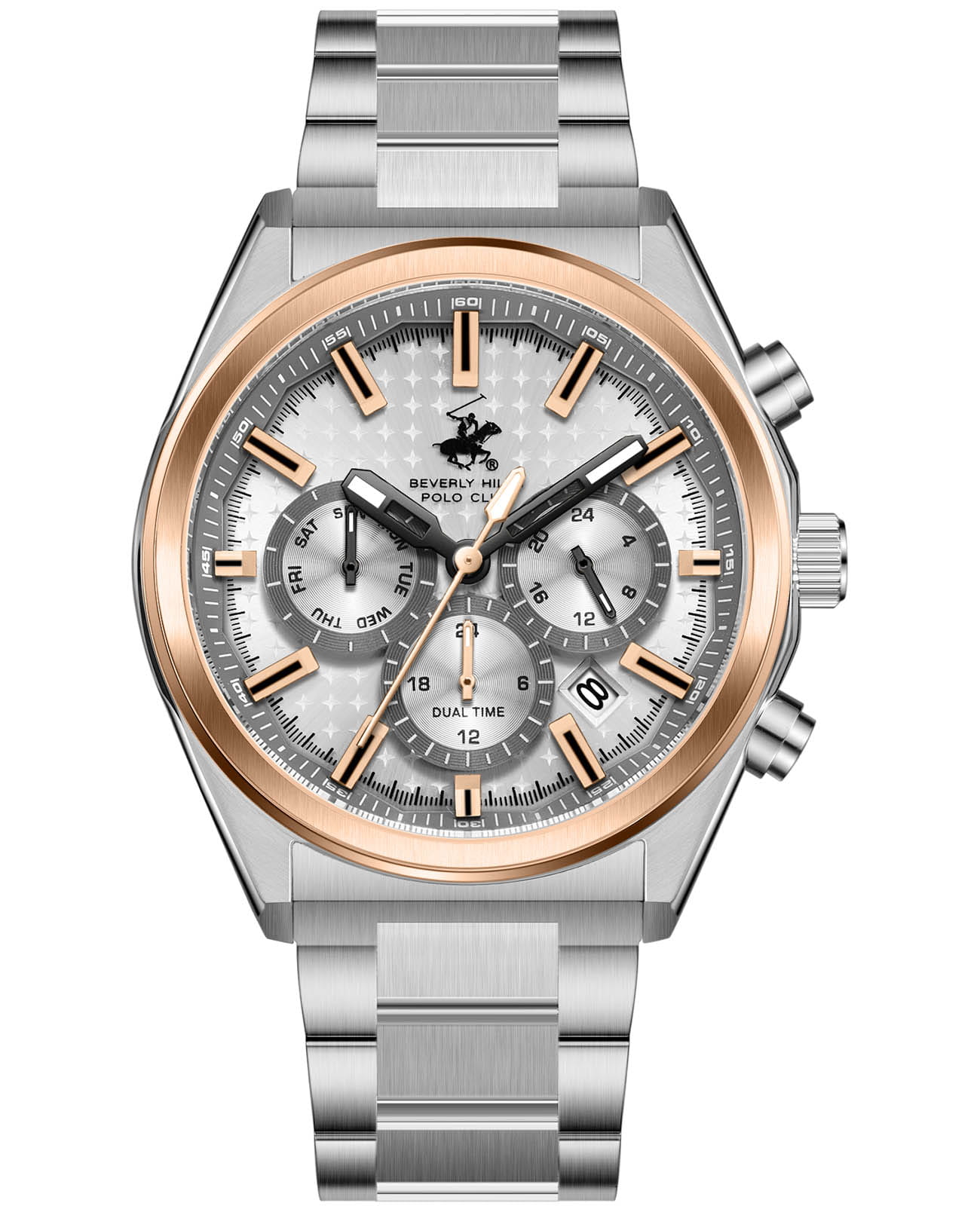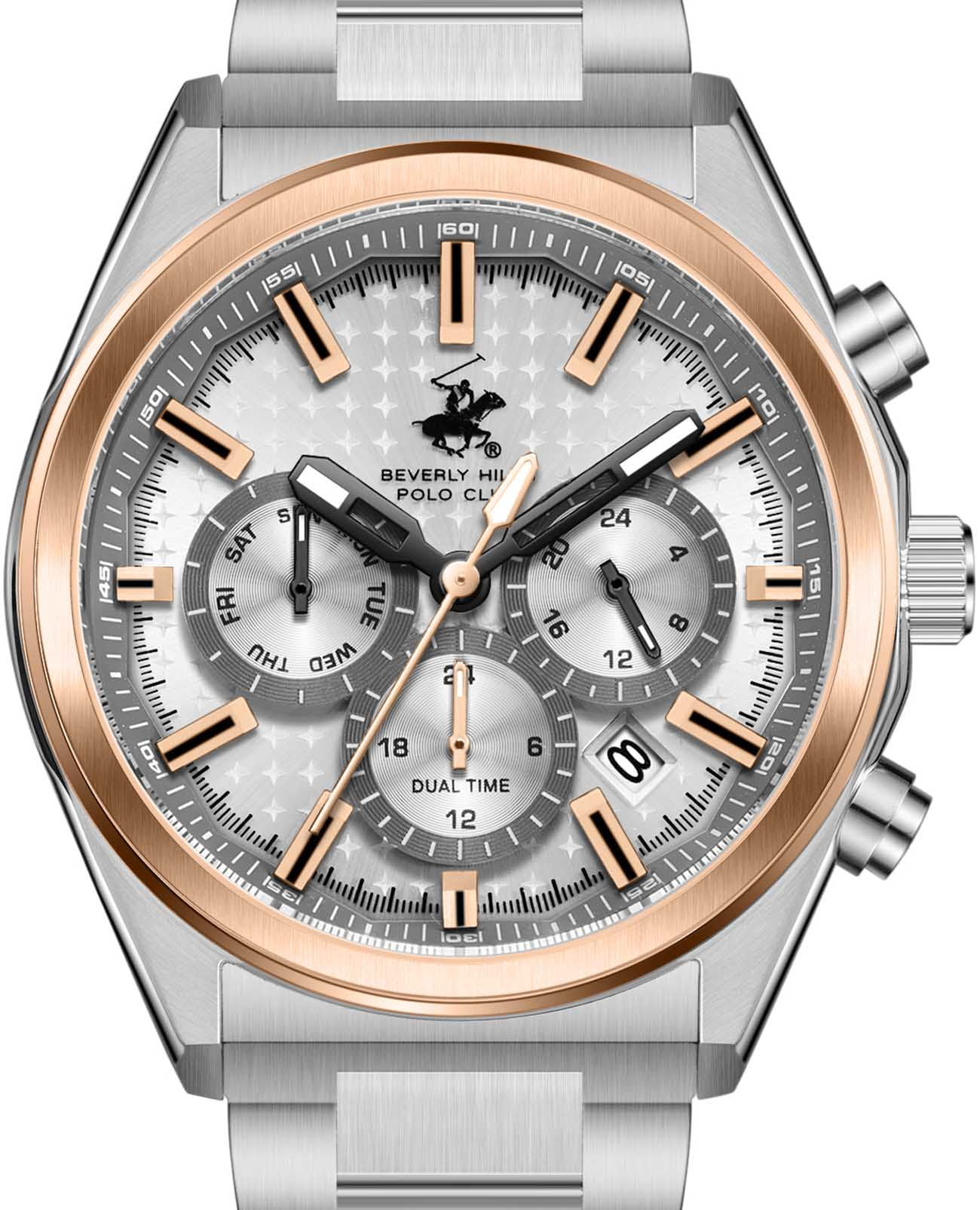 Мужские кварцевые часы Beverly Hills Polo Club — это стильный аксессуар из коллекции Summer 25. Корпус диаметром 42 мм выполнен из стали. БезельБезельВнешний ободок, закрепляющий стекло. В спортивных часах так называется поворотное кольцо с делениями на циферблате, выполняет роль таймера – замеряет отрезки времени на шкале. Неподвижный безель – элемент декора. Однонаправленно вращающийся безель на дайверских часах позволяет фиксировать моменты погружения и выныривания на поверхность. из нержавеющей стали с IP-покрытиемIP-покрытиеМетод ионного напыления. Демонстрирует повышенную устойчивость к истиранию, окислению и химическим веществам. Под воздействием высокого давления и температуры около 1500°C молекулы металла надёжно соединяются с частицами корпуса часов.. Циферблат серого цвета оформлен линейными индексами. Указатели дня недели, даты и 24-часового формата времени вынесены на отдельные субциферблаты. Циферблат защищён минеральным стекломМинеральное стеклоМинеральное стекло представляет собой искусственно выращенный минерал кварца. Такое стекло отличается особой устойчивостью к повреждениям и царапинам. Уступает по некоторым качествам сапфировому стеклу.. Часы оснащены стальным браслетом с застёжкой «бабочка» с кнопкамиЗастёжка "бабочка"Такой вид застёжки дополняется предохранителями, помогающими избежать случайного раскрытия браслета. Обладают изящным исполнением. . Водонепроницаемость 50 м позволяет использовать часы в повседневных условиях. Идеальный выбор для тех, кто ценит модный дизайн и надёжность.