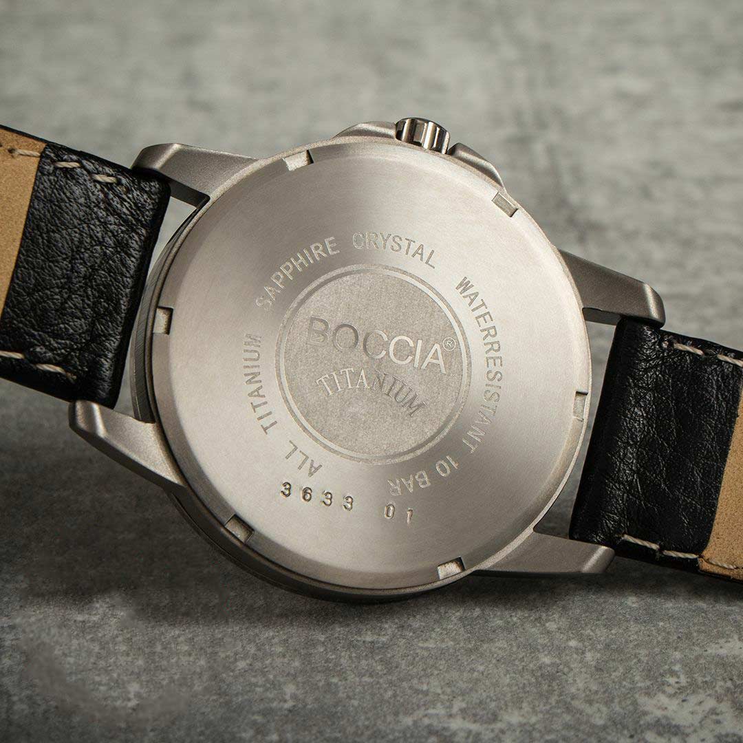 Мужские немецкие титановые часы Boccia Titanium 3633-01, кварцевый механизм с высокой точностью. Минеральное стеклоМинеральное стеклоМинеральное стекло представляет собой искусственно выращенный минерал кварца. Такое стекло отличается особой устойчивостью к повреждениям и царапинам. Уступает по некоторым качествам сапфировому стеклу. устойчивое к появлению царапин, обладающее высокой прозрачностью. Корпус изготовлен из титана. Класс водозащиты: 100 метров, позволит плавать, нырять и заниматься другими водными видами спорта. Кожаный ремешок на стандартной застёжке. Стрелки и метки с люминесцентным покрытиемЛюминесцентное покрытиеПозволяет считывать показания времени в темноте. Производители наносят на стрелки, часовые индексы, безель или поверхность циферблата светонакопительный состав, дающий холодное свечение..