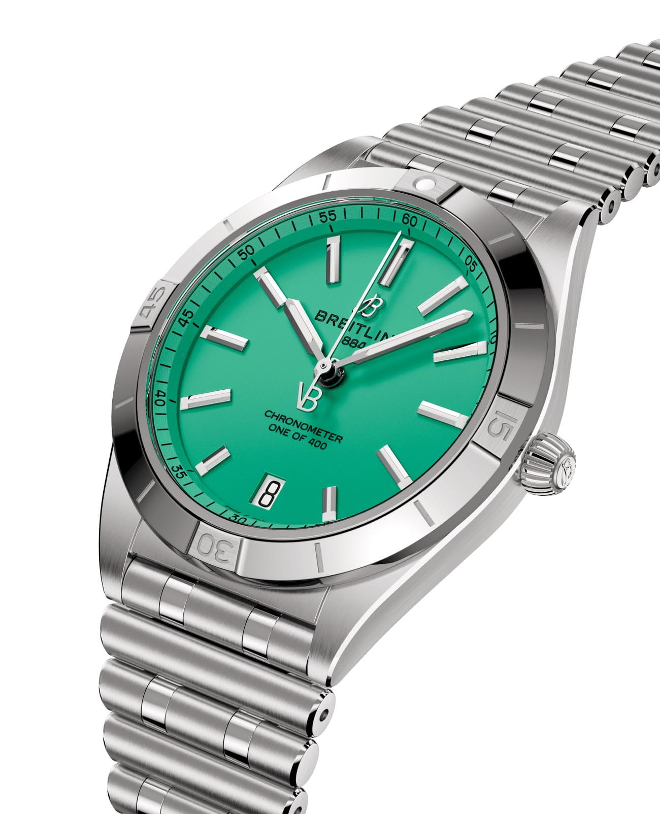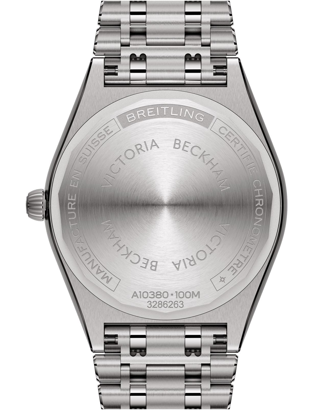 Женские швейцарские часы Breitling Chronomat Automatic 36 Victoria Beckham A103801A1L1A1 с надёжным автоматическим механизмом, выпущенные лимитированной серией всего из 1500 экземпляров в сотрудничестве с модным домом Victoria Beckham. Сапфировое стеклоСапфировое стеклоПрочный и надёжный материал из кристалла сапфира синтетического происхождения, характеризующийся особой твёрдостью и устойчивостью к царапинам и повреждениям. устойчивое к мелким механическим повреждениям. Корпус и браслет часов изготовлены из нержавеющей стали. Стальной браслет на застёжке-бабочке с кнопкамиЗастёжка "бабочка"Такой вид застёжки дополняется предохранителями, помогающими избежать случайного раскрытия браслета. Обладают изящным исполнением. . Стрелки и метки с люминесцентным покрытиемЛюминесцентное покрытиеПозволяет считывать показания времени в темноте. Производители наносят на стрелки, часовые индексы, безель или поверхность циферблата светонакопительный состав, дающий холодное свечение.. Класс водозащиты: 100 метров, позволит плавать, нырять и заниматься другими водными видами спорта. Окошко даты находится в положении 6 часов.