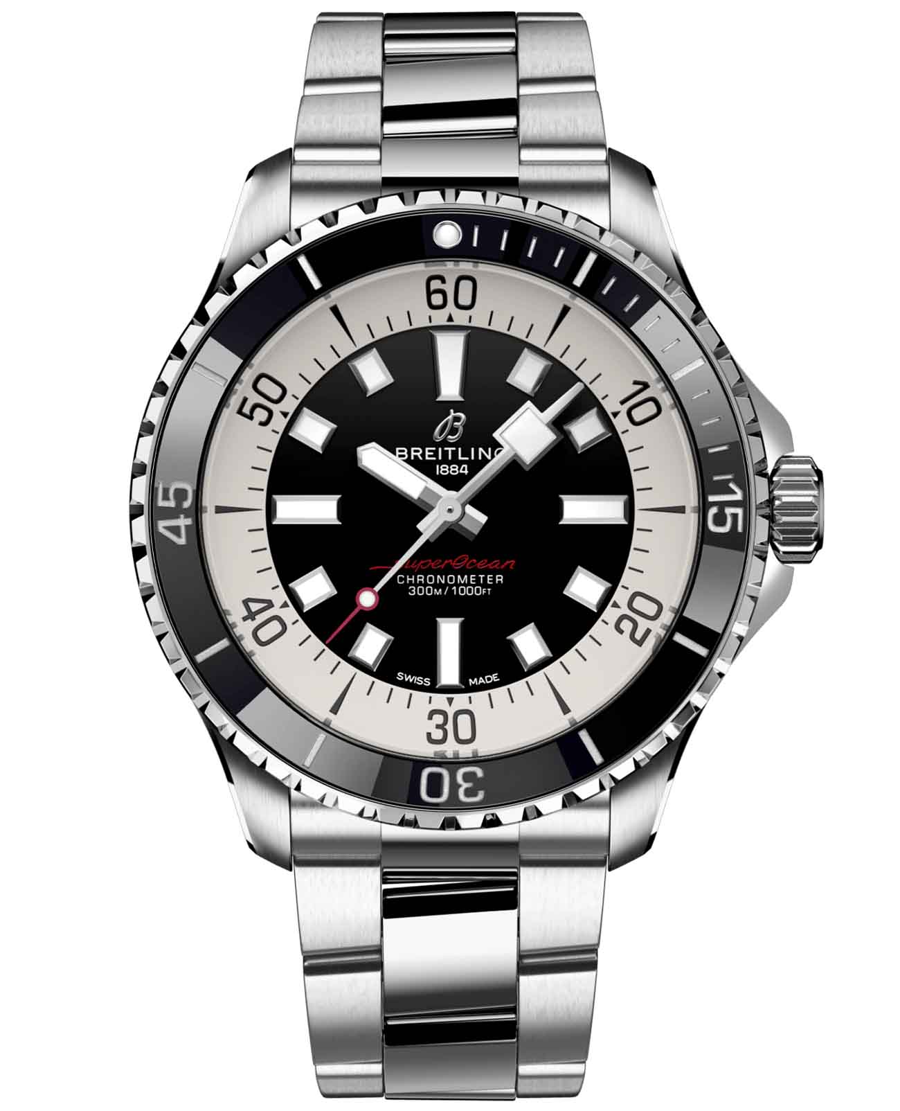 Мужские водонепроницаемые швейцарские часы Breitling Superocean Automatic 44 A17376211B1A1, механический механизм (автоматический калибр) с высокой точностью. Сапфировое стеклоСапфировое стеклоПрочный и надёжный материал из кристалла сапфира синтетического происхождения, характеризующийся особой твёрдостью и устойчивостью к царапинам и повреждениям. устойчивое к появлению царапин, обладающее высокой прозрачностью. Класс водозащиты: 300 метров, позволит плавать, нырять и заниматься другими водными видами спорта. Корпус часов изготовлен из стали. Стальной браслет с раскладной застёжкойРаскладная застёжкаТакой тип застёжки используется только на браслетах из металла. Она никогда не раскрывается полностью, происходит разделение на 2 и более частей. Раскладывающая застёжка снизит вероятность потери часов к минимуму.. Стрелки и метки с люминесцентным покрытиемЛюминесцентное покрытиеПозволяет считывать показания времени в темноте. Производители наносят на стрелки, часовые индексы, безель или поверхность циферблата светонакопительный состав, дающий холодное свечение.. Широкие стрелки и индексы с люминесцентным покрытиемЛюминесцентное покрытиеПозволяет считывать показания времени в темноте. Производители наносят на стрелки, часовые индексы, безель или поверхность циферблата светонакопительный состав, дающий холодное свечение. обеспечивают легкую читаемость под водой. БезельБезельВнешний ободок, закрепляющий стекло. В спортивных часах так называется поворотное кольцо с делениями на циферблате, выполняет роль таймера – замеряет отрезки времени на шкале. Неподвижный безель – элемент декора. Однонаправленно вращающийся безель на дайверских часах позволяет фиксировать моменты погружения и выныривания на поверхность. из стали с керамической инкрустацией, защищенный от царапин, никогда не изнашивается и не выцветает. Лучше всего то, что это больше не просто часы для дайвинга — занимайтесь с ними серфингом, плавайте с ними, заходите с ними в пляжный бар, а затем надевайте их на ужин. Superocean идеально сочетает ностальгию по своему наследию со свежим внешним видом.