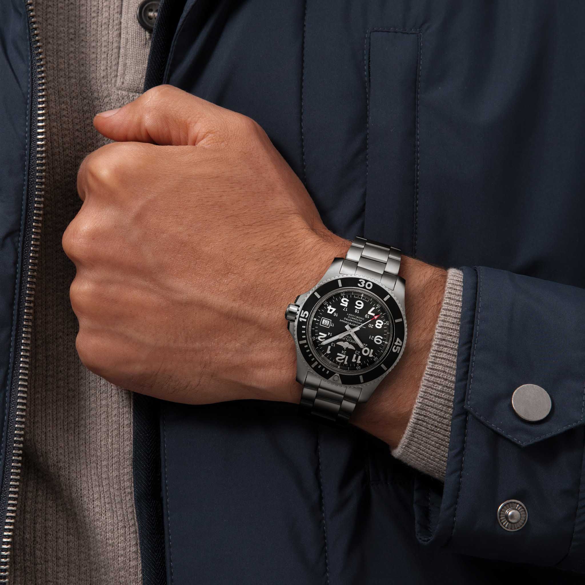Дайверские часы Superocean II 44, оснащенные прочным корпусом диаметром 44 мм из матированной стали, славятся своей исключительной водонепроницаемостью на глубине до 1000 м (3300 футов), а также сверхчитаемым черным или синим циферблатом с крупными цифрами и стрелками, усиленными люминесцентным покрытиемЛюминесцентное покрытиеПозволяет считывать показания времени в темноте. Производители наносят на стрелки, часовые индексы, безель или поверхность циферблата светонакопительный состав, дающий холодное свечение.. Предохранительный клапан служит для выравнивания разницы в давлении внутри и снаружи корпуса. Калибр с автоподзаводом, официально сертифицированный для хронометров, обеспечивает исключительную производительность и точность.