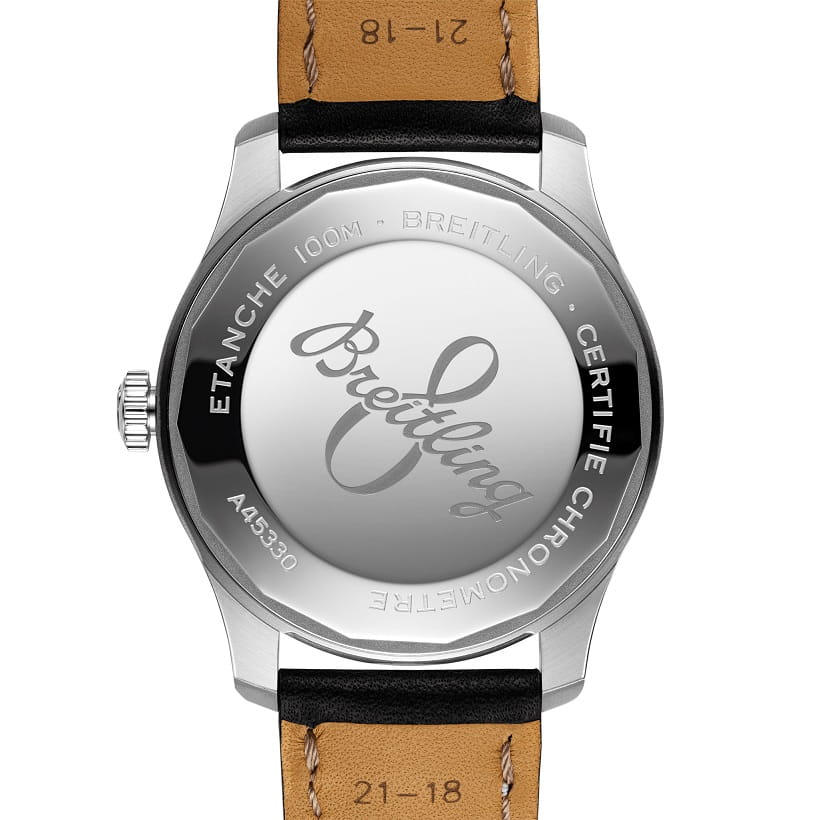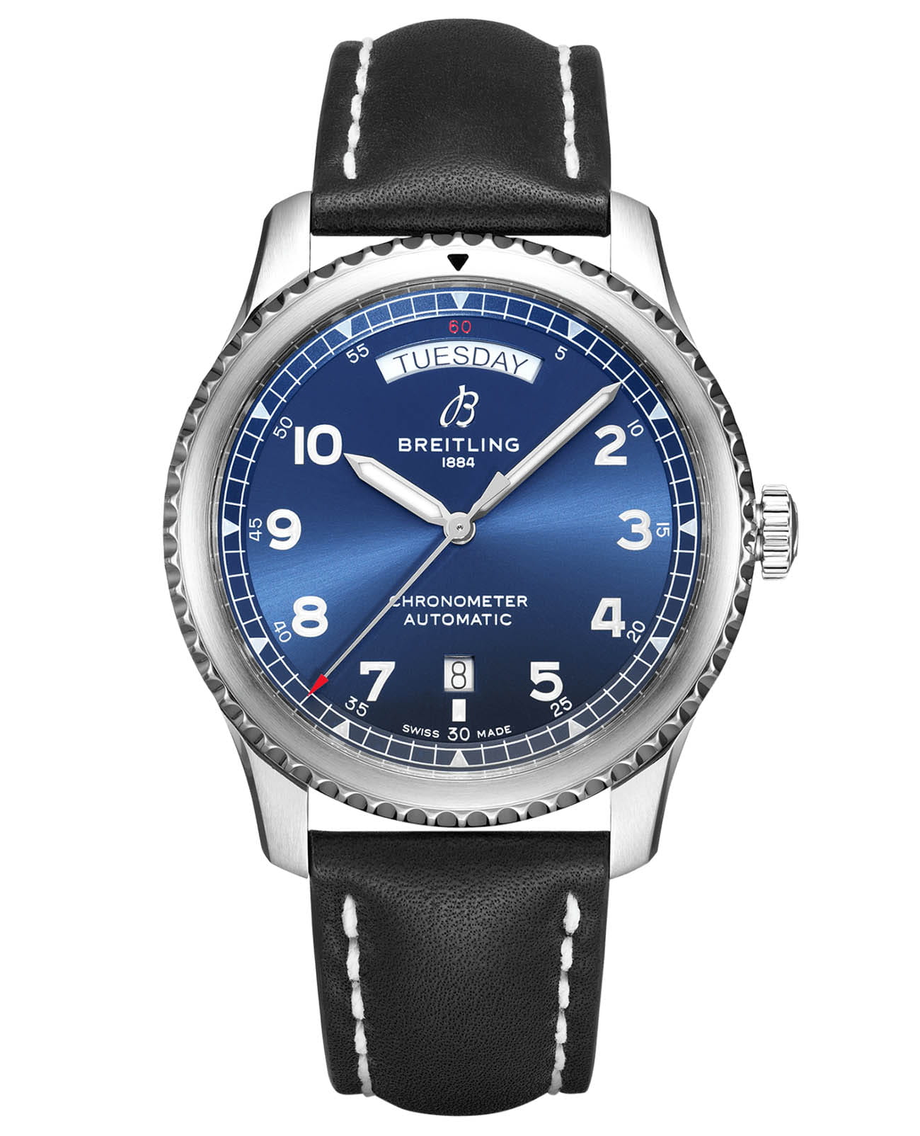 Модель Aviator 8 Automatic Day & Date 41 A45330101C1X4 отображает день недели, дату и время. Индикатор дня недели размещен в положении «12 часов» симметрично дате, в положении «6 часов». «Сердцем» модели этих автоматических наручных часов является калибр Breitling Caliber 45, а двунаправленный ротор автоподзавода обеспечивает запас хода свыше 40 часов.
