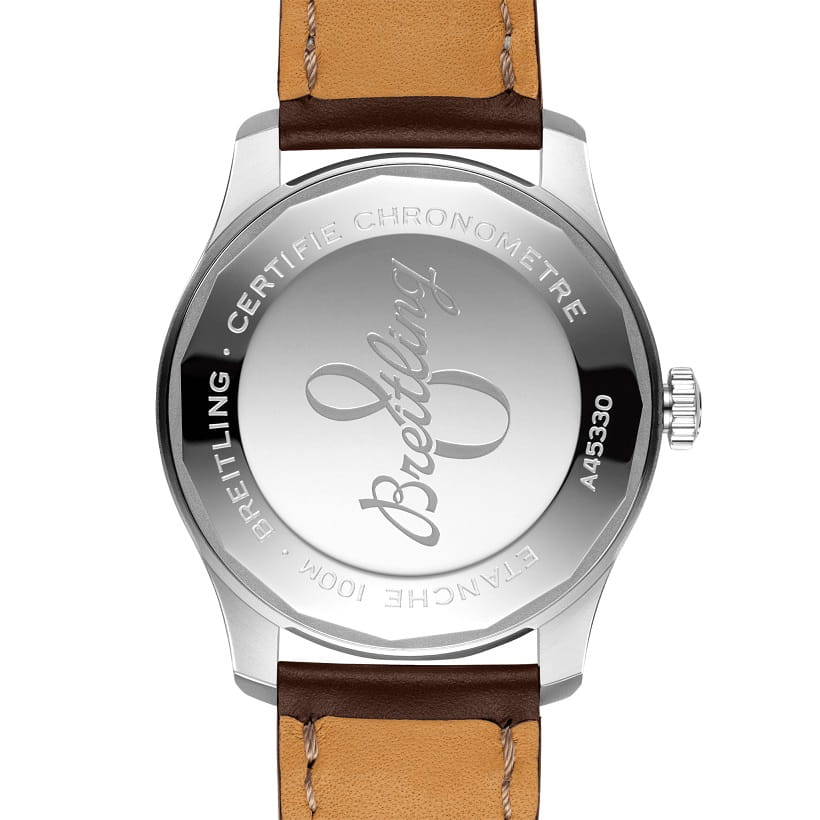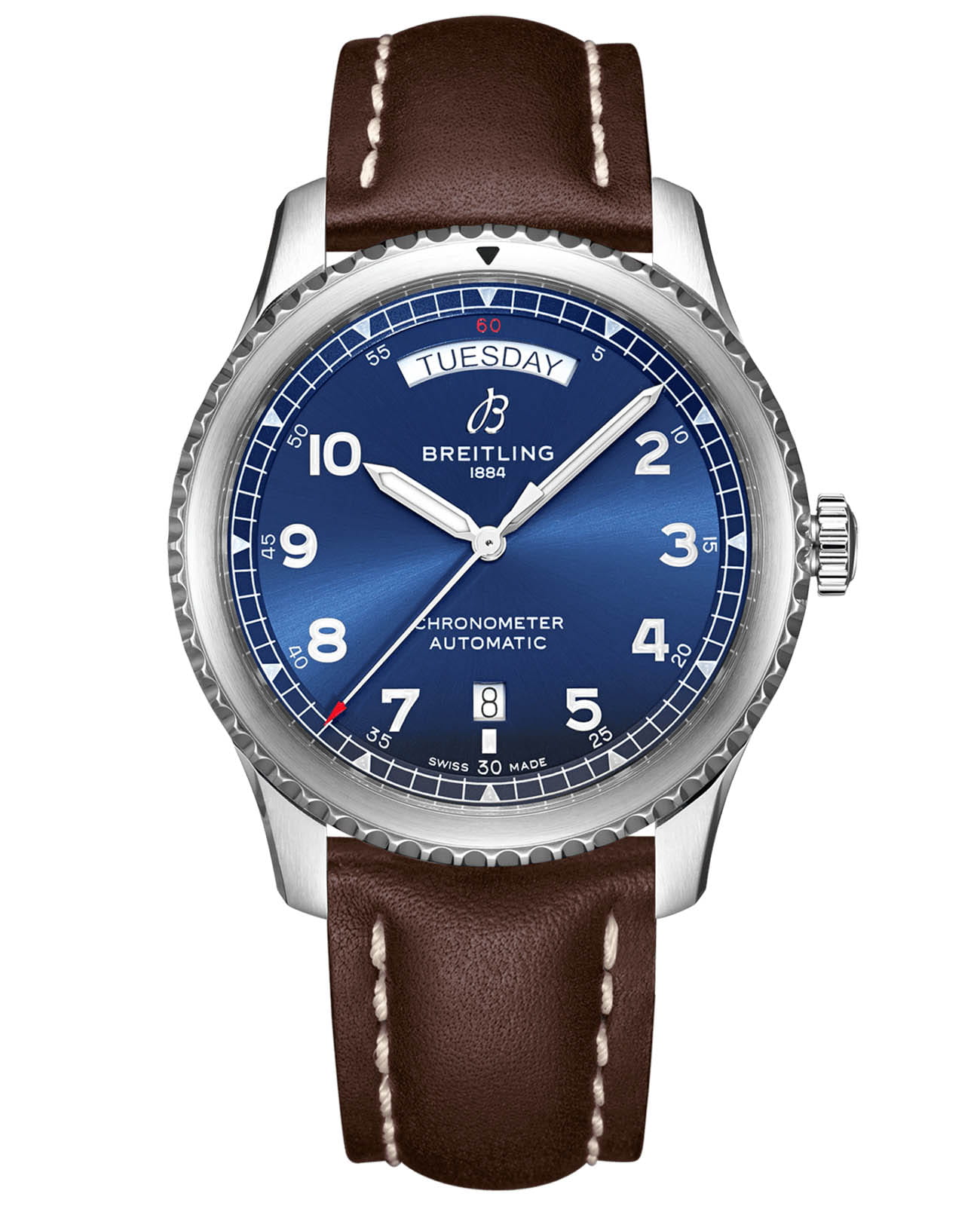 Модель Aviator 8 Automatic Day & Date 41 A45330101C1X6 отображает день недели, дату и время. Индикатор дня недели размещен в положении «12 часов» симметрично дате, в положении «6 часов». «Сердцем» модели этих автоматических наручных часов является калибр Breitling Caliber 45, а двунаправленный ротор автоподзавода обеспечивает запас хода свыше 40 часов.