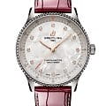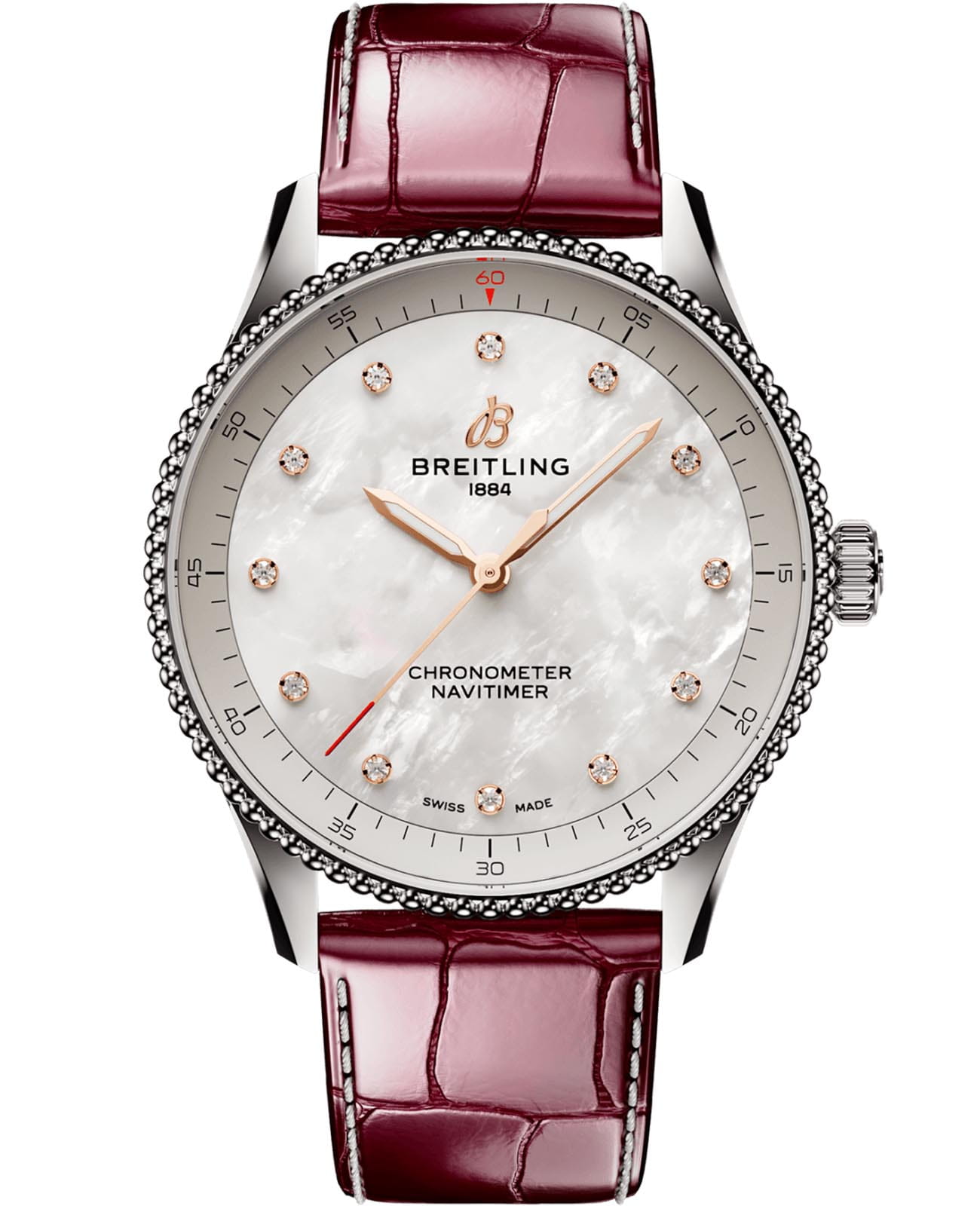 Швейцарские унисекс часы-хронометр Breitling Navitimer Automatic 36 A77320E61A2P2, механический механизм (автоматический калибр) с высокой точностью. Сапфировое стеклоСапфировое стеклоПрочный и надёжный материал из кристалла сапфира синтетического происхождения, характеризующийся особой твёрдостью и устойчивостью к царапинам и повреждениям. устойчивое к появлению царапин, обладающее высокой прозрачностью. Класс водозащиты: 50 метров, позволит защитить корпус от случайных брызг или капель дождя. Корпус часов изготовлен из нержавеющей стали. Ремешок из кожи аллигатора с раскладной застёжкойРаскладная застёжкаТакой тип застёжки используется только на браслетах из металла. Она никогда не раскрывается полностью, происходит разделение на 2 и более частей. Раскладывающая застёжка снизит вероятность потери часов к минимуму.. Стрелки с люминесцентным покрытиемЛюминесцентное покрытиеПозволяет считывать показания времени в темноте. Производители наносят на стрелки, часовые индексы, безель или поверхность циферблата светонакопительный состав, дающий холодное свечение.. Циферблат инкрустирован бриллантами.