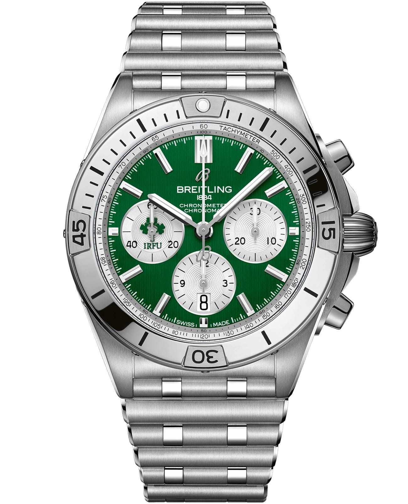 Лимитированные мужские швейцарские часы-хронографХронографФункция позволяет измерять отрезки времени с особой точностью: часы, минуты, секунды. Верным признаком хронографа является наличие на циферблате 3 дополнительных окошек-счётчиков. с секундомеромСекундомерСекундоме́р — прибор, способный измерять интервалы времени с точностью до долей секунды. Breitling Chronomat B01 42 Ireland AB0134A91L1A1, механический механизм (автоматический калибр) с высокой точностью. Основанный на хронографе Frecce Tricolori, который был разработан и выпущен в 1983 году в сотрудничестве со знаменитой итальянской авиационной эскадрильей, Chronomat стильно отпраздновал столетие Breitling и ознаменовал возвращение механическому хронографу его законного места в бренде, который построил свою мировую репутацию на этих невероятных часах. Сапфировое стеклоСапфировое стеклоПрочный и надёжный материал из кристалла сапфира синтетического происхождения, характеризующийся особой твёрдостью и устойчивостью к царапинам и повреждениям. устойчивое к появлению царапин, обладающее высокой прозрачностью. Класс водозащиты: 200 метров, позволит плавать, нырять и заниматься другими водными видами спорта. Корпус и браслет часов изготовлены из нержавеющей стали. Часы имеют сертификат COSCСертификат COSCОфициальный сертификат, подтверждающий то, что часы ходят с особо высокой точностью. Для получения документа часы подвергаются тестовым испытаниям, разработанным швейцарским институтом тестирования хронометров COSC. Допустимая норма для механических часов -4/+6 секунд в день, для кварцевых моделей +/- 0,07 секунд в день.. Стрелки и метки с люминесцентным покрытиемЛюминесцентное покрытиеПозволяет считывать показания времени в темноте. Производители наносят на стрелки, часовые индексы, безель или поверхность циферблата светонакопительный состав, дающий холодное свечение.. Шкала тахиметраТахиметрРазмеченная шкала, располагается на ободке или безеле часов. Тахиметр позволяет рассчитать скорость на определённом участке пути, расстояние измеряется в километрах или милях. на циферблате. Окошко даты находится в положении 6 часов. Браслет с застёжкой-бабочкой с кнопкамиЗастёжка "бабочка"Такой вид застёжки дополняется предохранителями, помогающими избежать случайного раскрытия браслета. Обладают изящным исполнением. .