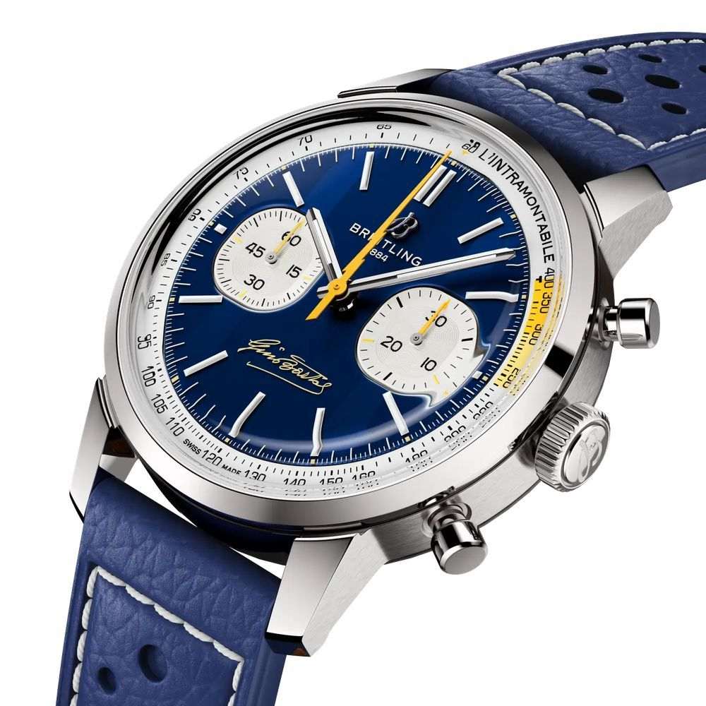 Breitling Top Time B01 Gino Bartali AB01767A1C1X1 — лимитированная модель, объединяющая дух велоспорта, винтажный стиль и высокоточную механику. Корпус диаметром 41 мм выполнен из нержавеющей стали с полированной отделкой. Прозрачная задняя крышка украшена гравировкой «Gino Bartali Tribute» и пометкой «One of 750», подчёркивающей эксклюзивность выпуска. Циферблат защищён сапфировым стекломСапфировое стеклоПрочный и надёжный материал из кристалла сапфира синтетического происхождения, характеризующийся особой твёрдостью и устойчивостью к царапинам и повреждениям. с антибликовым покрытиемАнтибликовое покрытиеСлой оксида металла в 0,13-0,3 микрон, благодаря которому стекло часов не бликует и не отражает свет. Антибликовое покрытие уменьшает отражение света в 10 раз, обеспечивая отличную читаемость показателей циферблата.. Синий матовый циферблат выполнен в стиле би-компакс с двумя белыми субциферблатами. На внешней шкале расположена надпись «L'Intramontabile», а на отметке «6 часов» — подпись Джино Бартали. Внутри установлен автоматический швейцарский хронографХронографФункция позволяет измерять отрезки времени с особой точностью: часы, минуты, секунды. Верным признаком хронографа является наличие на циферблате 3 дополнительных окошек-счётчиков. калибра Breitling B01 без даты, с запасом хода до 70 часов. Механизм сертифицирован по стандарту COSCСертификат COSCОфициальный сертификат, подтверждающий то, что часы ходят с особо высокой точностью. Для получения документа часы подвергаются тестовым испытаниям, разработанным швейцарским институтом тестирования хронометров COSC. Допустимая норма для механических часов -4/+6 секунд в день, для кварцевых моделей +/- 0,07 секунд в день., что гарантирует высокую точность. Модель комплектуется перфорированным кожаным ремешком синего цвета с раскладной застёжкойРаскладная застёжкаТакой тип застёжки используется только на браслетах из металла. Она никогда не раскрывается полностью, происходит разделение на 2 и более частей. Раскладывающая застёжка снизит вероятность потери часов к минимуму., обеспечивающей надёжную и комфортную посадку. Водонепроницаемость 100 метров делает часы надёжными спутниками в активной жизни. Идеальный выбор для тех, кто ценит историческое наследие, эстетику 60-х и современное исполнение.