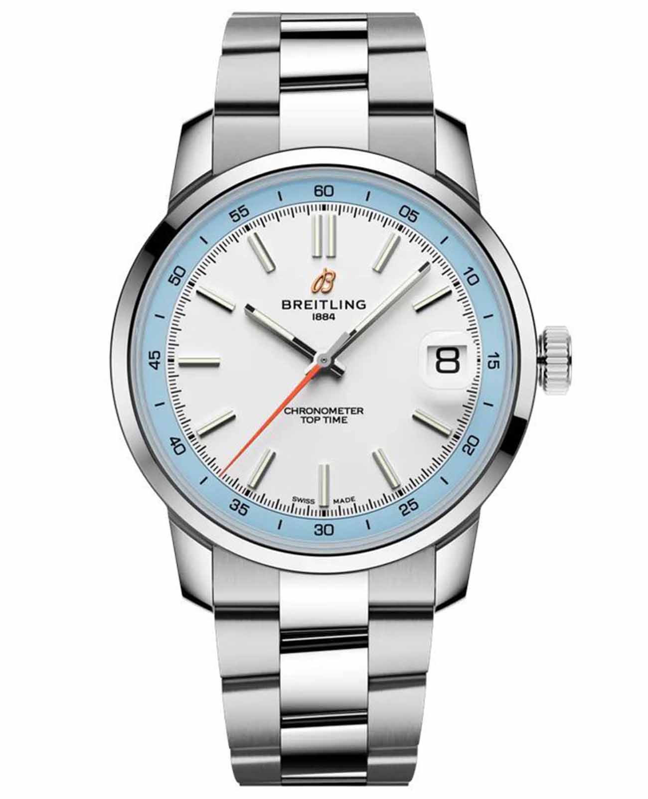 Breitling Top Time B31 AB3113281A1A1 — новаторская модель 2025 года, выполненная в духе ретро-дизайна и оснащённая новым автоматическим механизмом собственного производства. Корпус диаметром 38 мм изготовлен из нержавеющей стали с полированной отделкой. Задняя крышка с винтовым креплением и прозрачным окном демонстрирует работу калибра. Циферблат защищён выпуклым сапфировым стекломСапфировое стеклоПрочный и надёжный материал из кристалла сапфира синтетического происхождения, характеризующийся особой твёрдостью и устойчивостью к царапинам и повреждениям. с двухсторонним антибликовым покрытиемАнтибликовое покрытиеСлой оксида металла в 0,13-0,3 микрон, благодаря которому стекло часов не бликует и не отражает свет. Антибликовое покрытие уменьшает отражение света в 10 раз, обеспечивая отличную читаемость показателей циферблата.. Белый циферблат с бирюзовым внутренним кольцом оформлен в стиле классических приборных панелей. Часовые метки и стрелки покрыты люминесцентным покрытиемЛюминесцентное покрытиеПозволяет считывать показания времени в темноте. Производители наносят на стрелки, часовые индексы, безель или поверхность циферблата светонакопительный состав, дающий холодное свечение., обеспечивая читаемость при любом освещении. Внутри установлен новый автоматический калибр Breitling B31, отображающий часы, минуты и малую секундную стрелку. Запас хода составляет до 78 часов, а частота — 28 800 полуколебаний в час. Модель укомплектована стальным браслетом на раскладной застёжкойРаскладная застёжкаТакой тип застёжки используется только на браслетах из металла. Она никогда не раскрывается полностью, происходит разделение на 2 и более частей. Раскладывающая застёжка снизит вероятность потери часов к минимуму.. Водонепроницаемость 100 метров делает часы практичным выбором для повседневной активности. Top Time B31 AB3113281A1A1 — утончённый стиль, высокоточная механика и характерная винтажная подача в современной интерпретации.