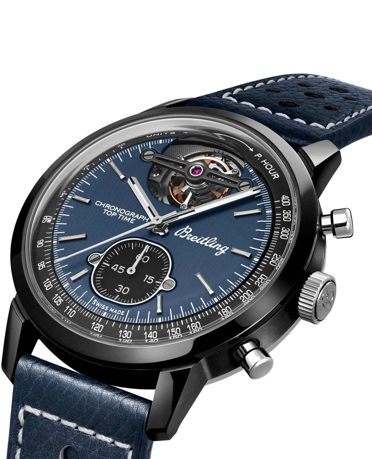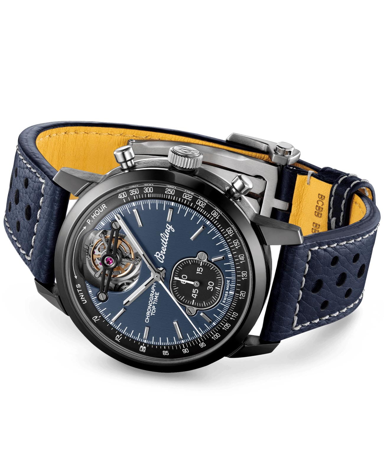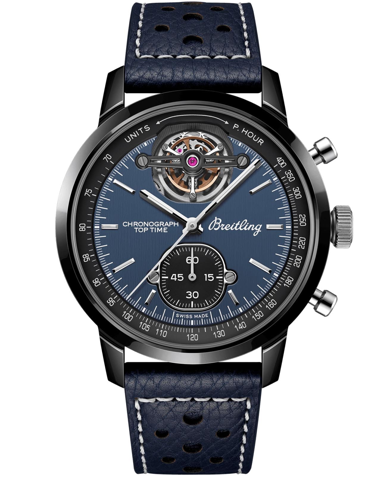 Мужские наручные часы c хронографомХронографФункция позволяет измерять отрезки времени с особой точностью: часы, минуты, секунды. Верным признаком хронографа является наличие на циферблате 3 дополнительных окошек-счётчиков. Breitling Top Time B21 Shelby Cobra SB21251A1C1X1, надежный автоматический механизм. Корпус часов изготовлен из керамики. Практичный кожаный ремешок на стандартной застёжке. ТахиметрТахиметрРазмеченная шкала, располагается на ободке или безеле часов. Тахиметр позволяет рассчитать скорость на определённом участке пути, расстояние измеряется в километрах или милях., сапфировое стеклоСапфировое стеклоПрочный и надёжный материал из кристалла сапфира синтетического происхождения, характеризующийся особой твёрдостью и устойчивостью к царапинам и повреждениям. повышенной прозрачности, устойчивое к мелким механическим повреждениям. Стрелки и метки с люминесцентным покрытиемЛюминесцентное покрытиеПозволяет считывать показания времени в темноте. Производители наносят на стрелки, часовые индексы, безель или поверхность циферблата светонакопительный состав, дающий холодное свечение..