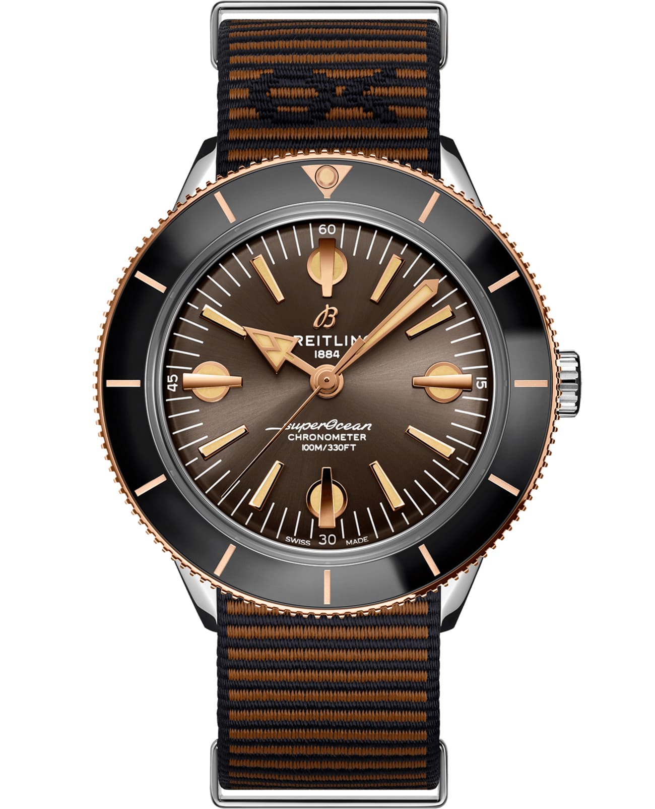 Часы Superocean Heritage ’57 Outerknown, ставшие результатом совместной работы Breitling и компании Келли Слейтера, занимающейся производством одежды для серфинга, предлагаются в комплекте с коричневым цельным ремешком Outerknown из волокна ECONYL®. «Сердце» этих часов – механизм Breitling Caliber 10, сертифицированный Швейцарским институтом официального тестирования хронометров (COSC).