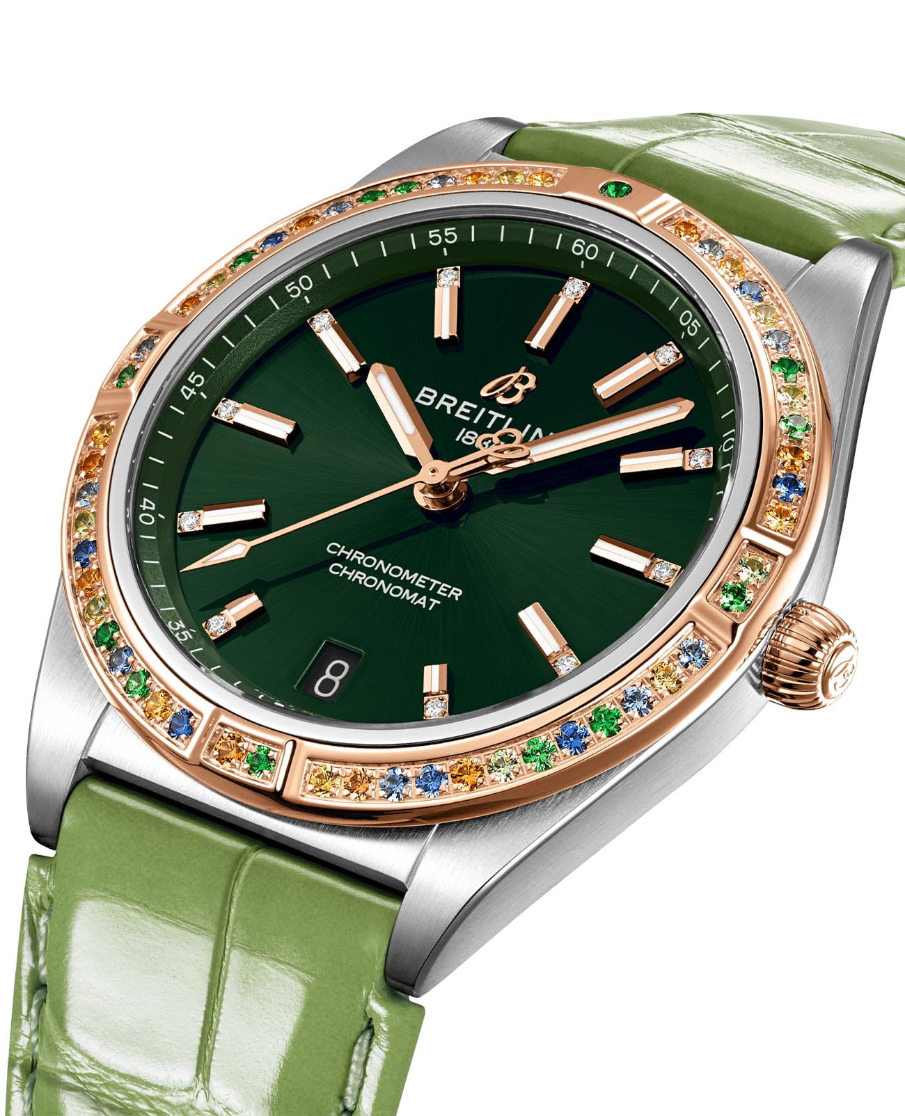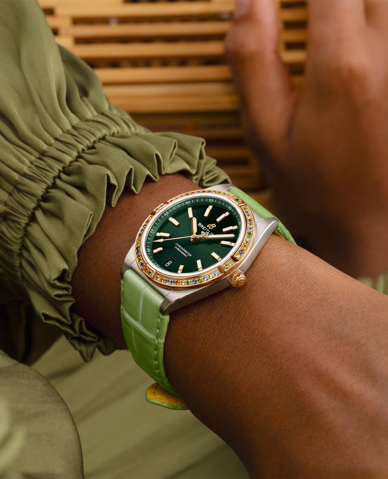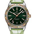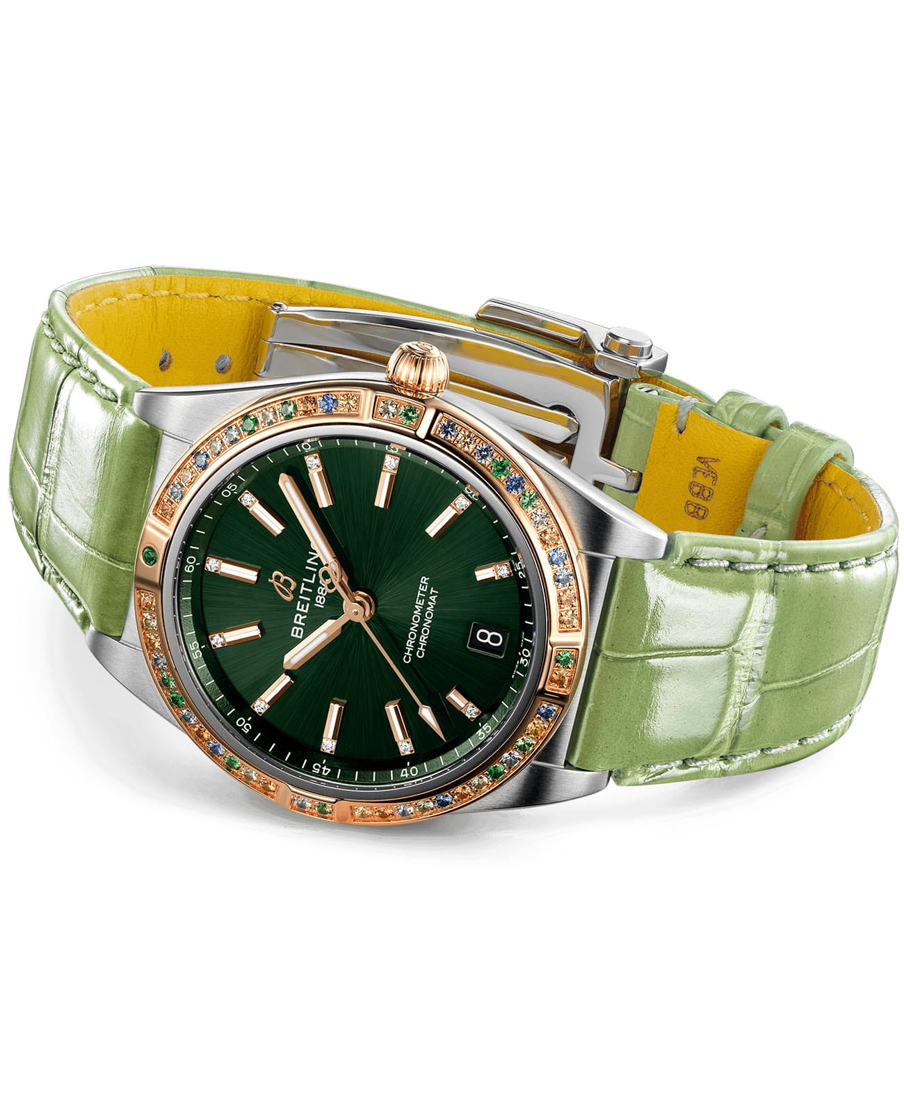 и циферблат инкрустированы бриллиантами. Ремешок из кожи аллигатора с раскладной застёжкойРаскладная застёжкаТакой тип застёжки используется только на браслетах из металла. Она никогда не раскрывается полностью, происходит разделение на 2 и более частей. Раскладывающая застёжка снизит вероятность потери часов к минимуму.. Стрелки и метки с люминесцентным покрытиемЛюминесцентное покрытиеПозволяет считывать показания времени в темноте. Производители наносят на стрелки, часовые индексы, безель или поверхность циферблата светонакопительный состав, дающий холодное свечение.. Класс водозащиты: 100 метров, позволит плавать, нырять и заниматься другими водными видами спорта.