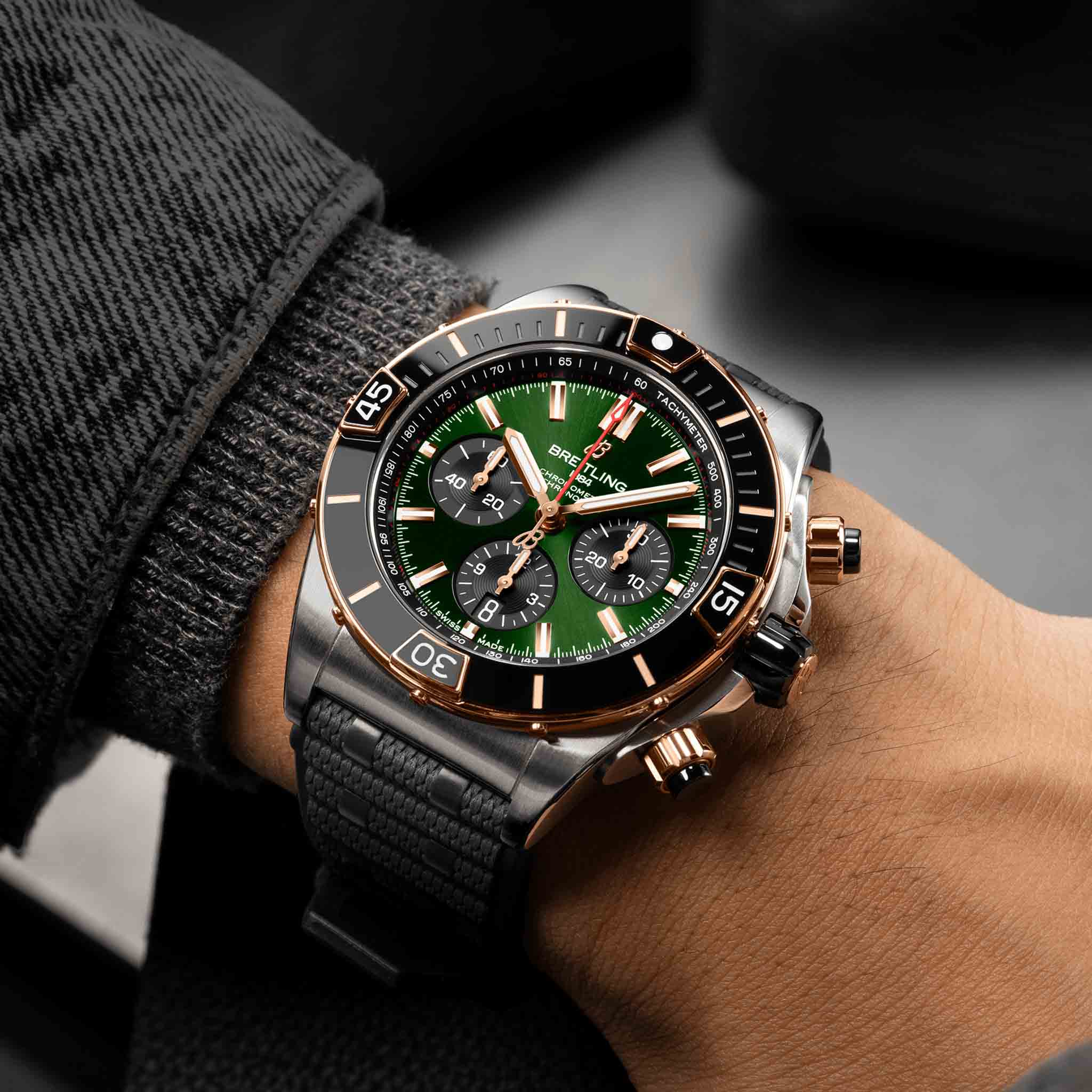 Мужские швейцарские часы-хронографХронографФункция позволяет измерять отрезки времени с особой точностью: часы, минуты, секунды. Верным признаком хронографа является наличие на циферблате 3 дополнительных окошек-счётчиков. с секундомеромСекундомерСекундоме́р — прибор, способный измерять интервалы времени с точностью до долей секунды. Breitling Super Chronomat B01 44 UB0136251L1S1, механический механизм (автоматический калибр) с высокой точностью. Сапфировое стеклоСапфировое стеклоПрочный и надёжный материал из кристалла сапфира синтетического происхождения, характеризующийся особой твёрдостью и устойчивостью к царапинам и повреждениям. устойчивое к появлению царапин, обладающее высокой прозрачностью. Класс водозащиты: 200 метров, позволит плавать, нырять и заниматься другими водными видами спорта. Корпус часов изготовлен из стали и 18-каратного золота18-каратное золотоОбозначение по каратной системе пробирования, оно показывает, сколько драгоценного металла содержится в изделии. 18 карат - в составе 75% чистого золота, соответствует 750 пробе.