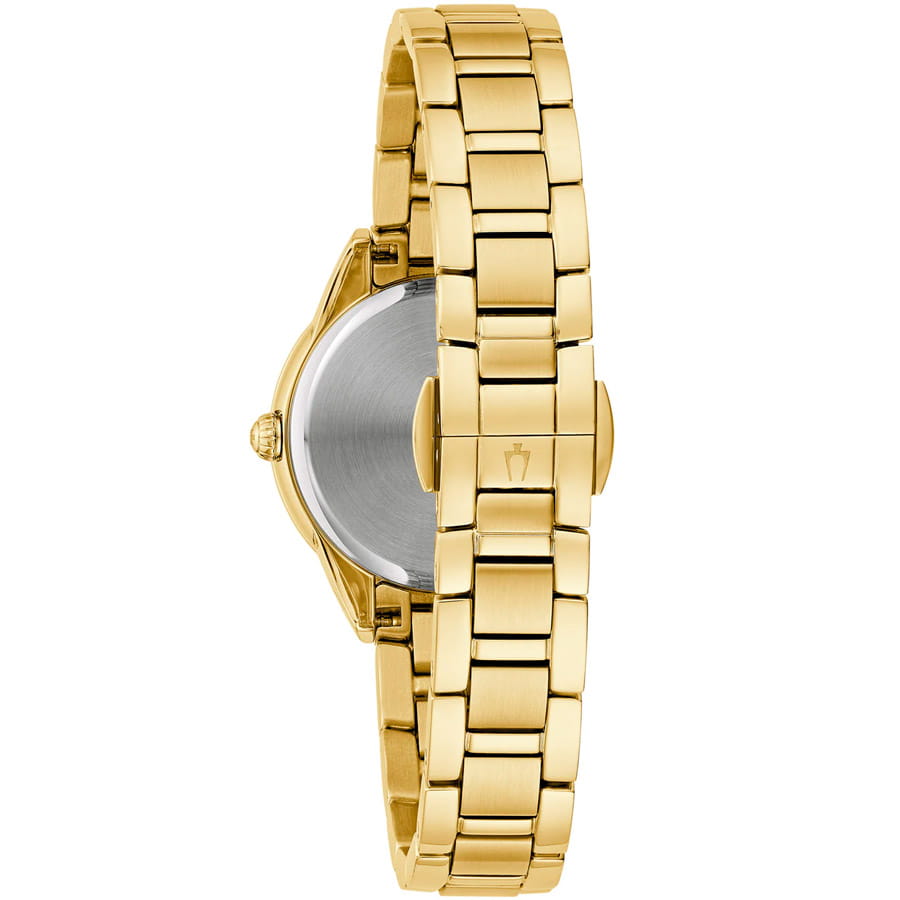 Женские кварцевые часы Bulova Sutton 98R297 – отражающий идеальное сочетание современного дизайна, надёжности и функциональности. Элегантный облик станет превосходным завершением образа, наделив его индивидуальным характером. Корпус из нержавеющей стали с IP-покрытиемIP-покрытиеМетод ионного напыления. Демонстрирует повышенную устойчивость к истиранию, окислению и химическим веществам. Под воздействием высокого давления и температуры около 1500°C молекулы металла надёжно соединяются с частицами корпуса часов. золотистого цвета, диаметром 28 мм идеально сбалансирован и элегантен. Сапфировое стеклоСапфировое стеклоПрочный и надёжный материал из кристалла сапфира синтетического происхождения, характеризующийся особой твёрдостью и устойчивостью к царапинам и повреждениям. защищает циферблат от царапин и устойчивое к механическим повреждениям. БезельБезельВнешний ободок, закрепляющий стекло. В спортивных часах так называется поворотное кольцо с делениями на циферблате, выполняет роль таймера – замеряет отрезки времени на шкале. Неподвижный безель – элемент декора. Однонаправленно вращающийся безель на дайверских часах позволяет фиксировать моменты погружения и выныривания на поверхность. украшен бриллиантами. Стальной браслет с IP-покрытиемIP-покрытиеМетод ионного напыления. Демонстрирует повышенную устойчивость к истиранию, окислению и химическим веществам. Под воздействием высокого давления и температуры около 1500°C молекулы металла надёжно соединяются с частицами корпуса часов. на застёжке-бабочке с кнопкамиЗастёжка "бабочка"Такой вид застёжки дополняется предохранителями, помогающими избежать случайного раскрытия браслета. Обладают изящным исполнением. обеспечивает комфортное ношение. Водозащита 30 метров позволит защитить корпус от случайных брызг или капель дождя. Эта модель – отличный выбор для тех, кто ищет сочетание стиля, качества и функциональности. Часы станут не только полезным аксессуаром, но и выразительным элементом вашего имиджа.