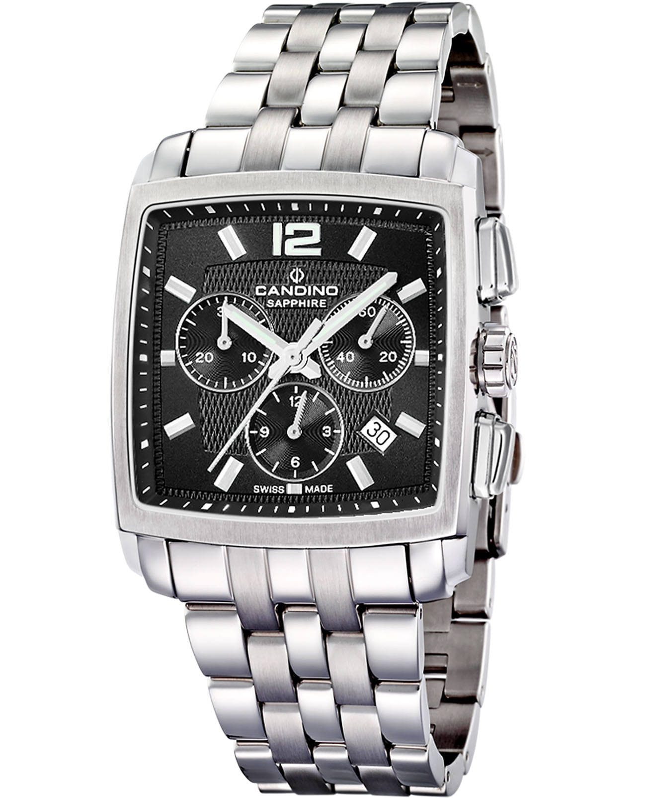 Candino C4374/M, мужские кварцевые часы-хронограф. Квадратный корпус 36×36 мм, толщина 11 мм, корпус и браслет из нержавеющей стали 316L. Чёрный циферблат с тремя субциферблатами хронографа, индикацией 12/24 часа и датой. Центральные стрелки и метки с люминисцентным покрытиемЛюминесцентное покрытиеПозволяет считывать показания времени в темноте. Производители наносят на стрелки, часовые индексы, безель или поверхность циферблата светонакопительный состав, дающий холодное свечение. — удобное считывание при слабом освещении. Швейцарский механизм с функцией секундомера. Стекло — сапфировоеСапфировое стеклоПрочный и надёжный материал из кристалла сапфира синтетического происхождения, характеризующийся особой твёрдостью и устойчивостью к царапинам и повреждениям., устойчивое к царапинам. Водозащита 50 м — защита от дождя и брызг. Стальной браслет шириной 23 мм с раскладной застёжкойРаскладная застёжкаТакой тип застёжки используется только на браслетах из металла. Она никогда не раскрывается полностью, происходит разделение на 2 и более частей. Раскладывающая застёжка снизит вероятность потери часов к минимуму.. Компактный квадратный формат, хронограф и швейцарская точность - практичный выбор для тех, кто ценит функциональность без визуальной перегруженности.