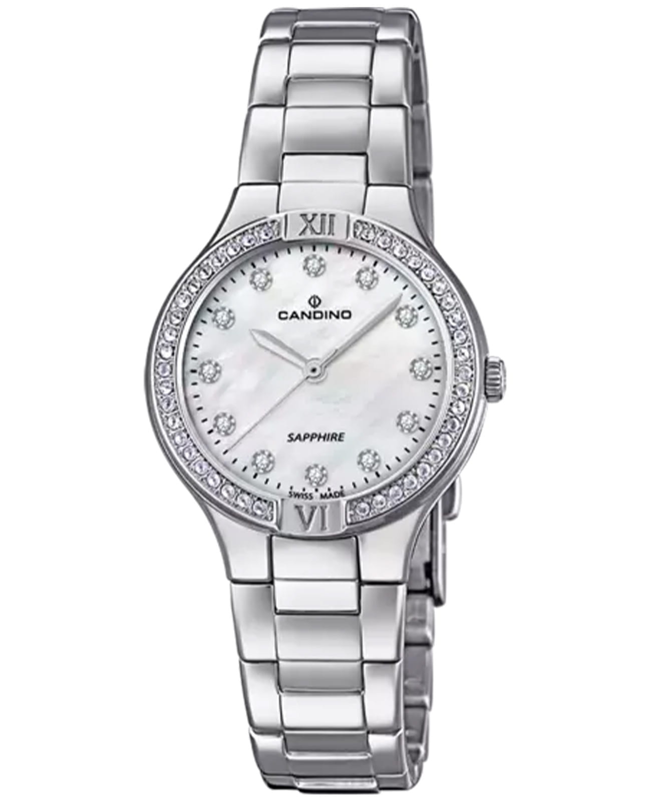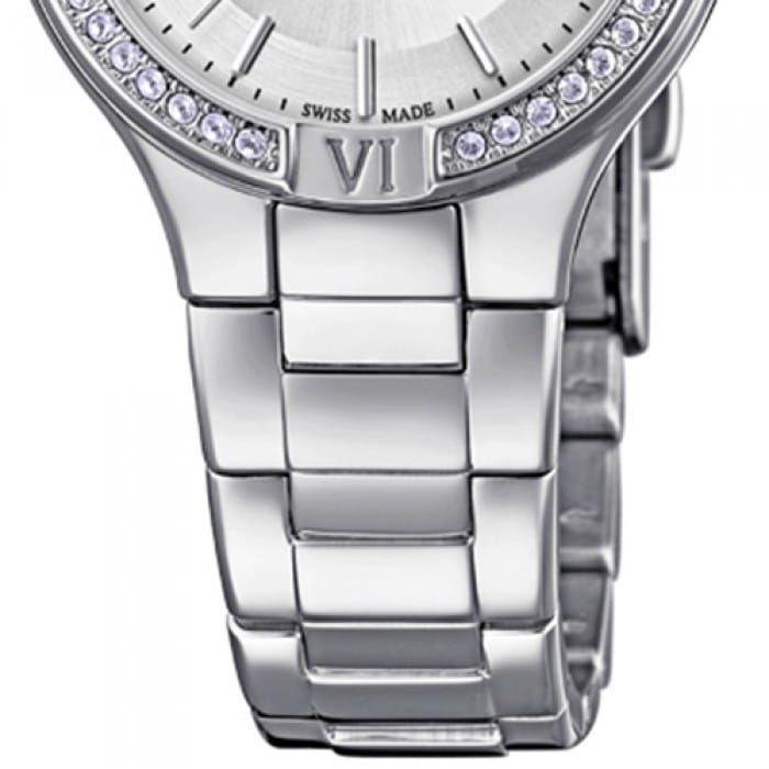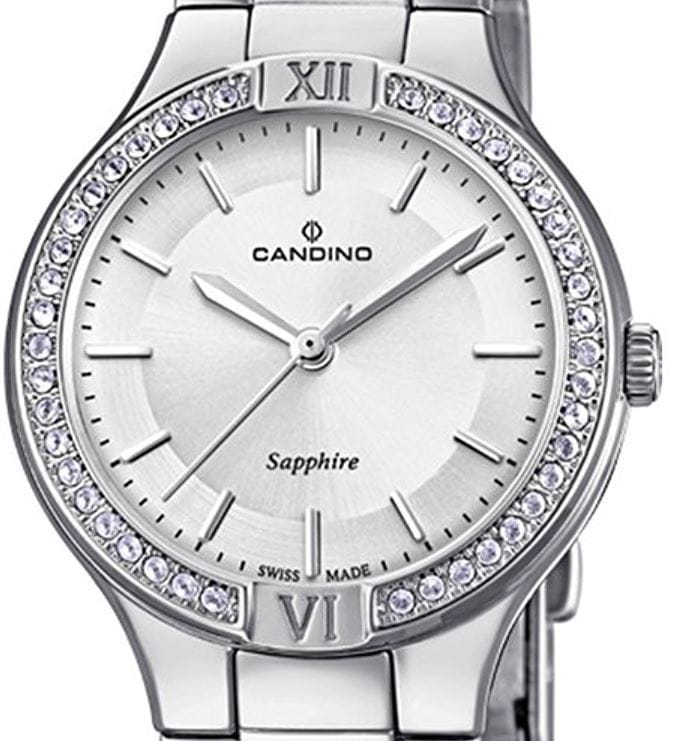 Женские швейцарские часы с кристаллами на безелеБезельВнешний ободок, закрепляющий стекло. В спортивных часах так называется поворотное кольцо с делениями на циферблате, выполняет роль таймера – замеряет отрезки времени на шкале. Неподвижный безель – элемент декора. Однонаправленно вращающийся безель на дайверских часах позволяет фиксировать моменты погружения и выныривания на поверхность. и циферблате Candino Lady Petite C4626/3, кварцевый механизм с высокой точностью. Сапфировое стеклоСапфировое стеклоПрочный и надёжный материал из кристалла сапфира синтетического происхождения, характеризующийся особой твёрдостью и устойчивостью к царапинам и повреждениям. устойчивое к появлению царапин, обладающее высокой прозрачностью. Класс водозащиты: 50 метров, позволит защитить корпус от случайных брызг или капель дождя. Корпус часов изготовлен из стали. Браслет с раскладной застёжкойРаскладная застёжкаТакой тип застёжки используется только на браслетах из металла. Она никогда не раскрывается полностью, происходит разделение на 2 и более частей. Раскладывающая застёжка снизит вероятность потери часов к минимуму..