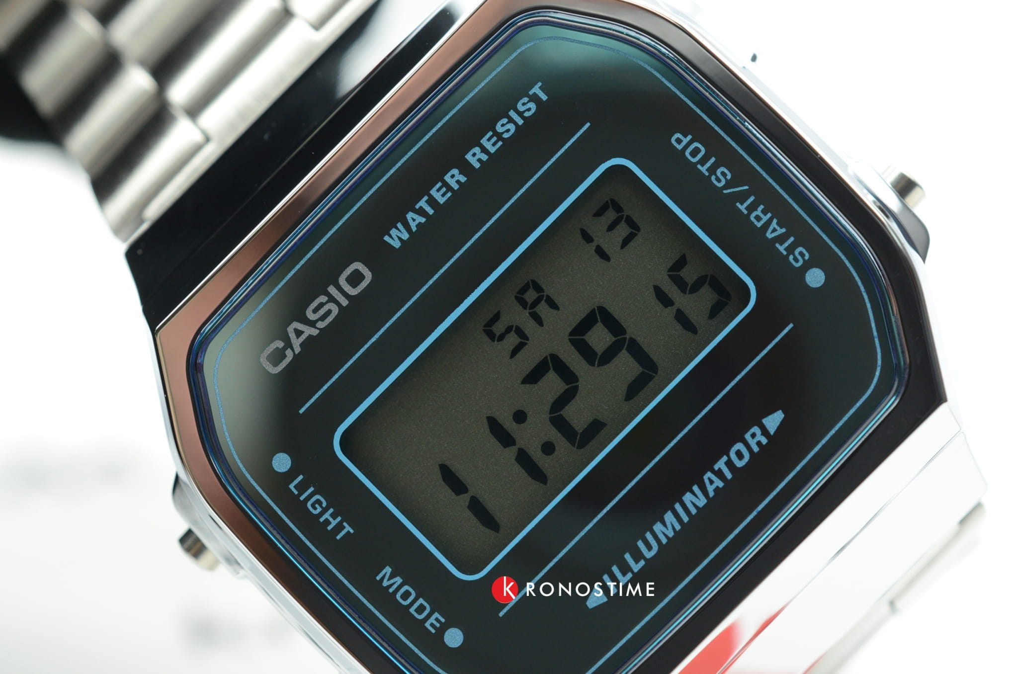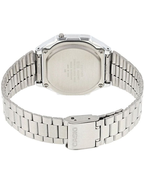 Серебристая цветовая гамма подойдёт к любой одежде, предоставляя простор для экспериментов. Цифровой дисплей в голубом цвете оснащён функцией подсветки, облегчающей считывание информации в темноте. Среди дополнительных возможностей числятся будильник, календарь, секундомер. Ударопрочный корпус сделан из полимерного пластика. Минеральное стекло отличается устойчивостью к появлению царапин. Габариты: 38,6 x 36,3 x 9,6 мм.