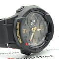 Чёрный циферблат дополнен контрастными стрелками и метками. Крупная индикация времени, арабские цифры позволили добиться оптимальной читаемости информации. Японский кварцевый механизм отличается высокой точностью хода. Калибр заключён в противоударный корпусУдаропрочный корпусМеханизм заключён в корпус, выполненный из современных материалов, устойчивых к ударам, механическим повреждениям и падению с высоты: инновационный пластик, карбон, нержавеющая сталь, титан. из надёжного пластика, устойчивого к повреждениям и падению. Батарейка SR726W рассчитана на 2-летний срок. Закаленное минеральное стекло. Светодиодная подсветкаСветодиодная подсветкаСветодиодная или LED-подсветка обеспечивает появление яркого холодного свечения за счёт LED-элементов - маленьких лампочек. Они потребляют минимальное количество энергии, чаще всего можно встретить 1 светодиод, в нижней части циферблата.. Включение и отключение звука кнопок. Водонепроницаемость 10 бар. Перемещение стрелок. Ежечасный сигнал. Будильник, мировое времяМировое время Полезное часовое усложнение, отображающее время в основных городах и известных областях по всему миру, оно связано с часовыми поясами, удобно для путешественников и бизнесменов. – 31 часовой пояс, таймер, UTCUTCВсемирное кординационное время, не имеющее привязки к географическому положению Гринвича, основывается на атомном отсчёте времени. Регулировка времени осуществляется более точно, чем устаревшее GMT.