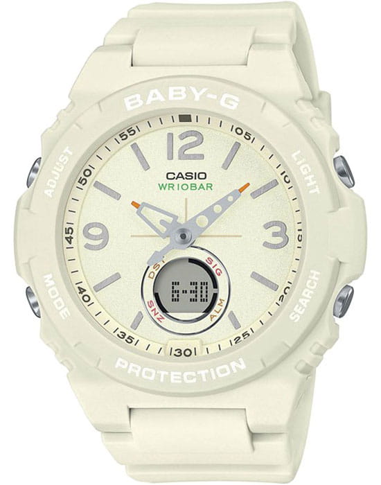 Модель из коллекции Baby-G представлена в светлом исполнении, белый и кремовый оттенки привлекательно смотрятся в любой ситуации.