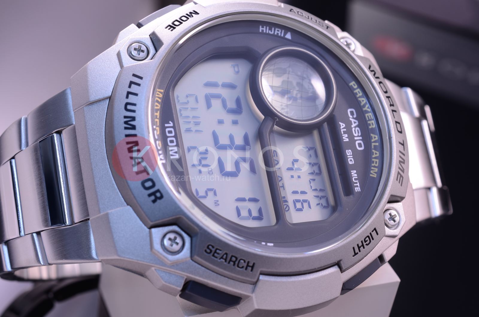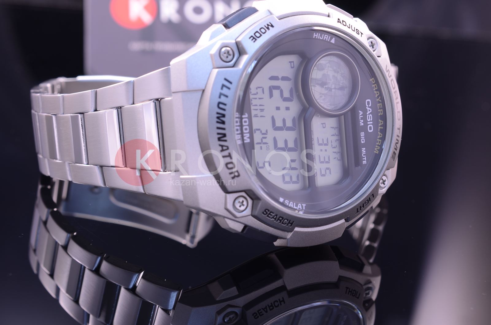 Стильный и современный дизайн. Часы предупреждают при наступлении каждой из 5-ти молитв. Мусульманский календарь. Отображается возраст и фаза луны. Светодиодная подсветкаСветодиодная подсветкаСветодиодная или LED-подсветка обеспечивает появление яркого холодного свечения за счёт LED-элементов - маленьких лампочек. Они потребляют минимальное количество энергии, чаще всего можно встретить 1 светодиод, в нижней части циферблата.. Водонепроницаемость составляет 100 WR.