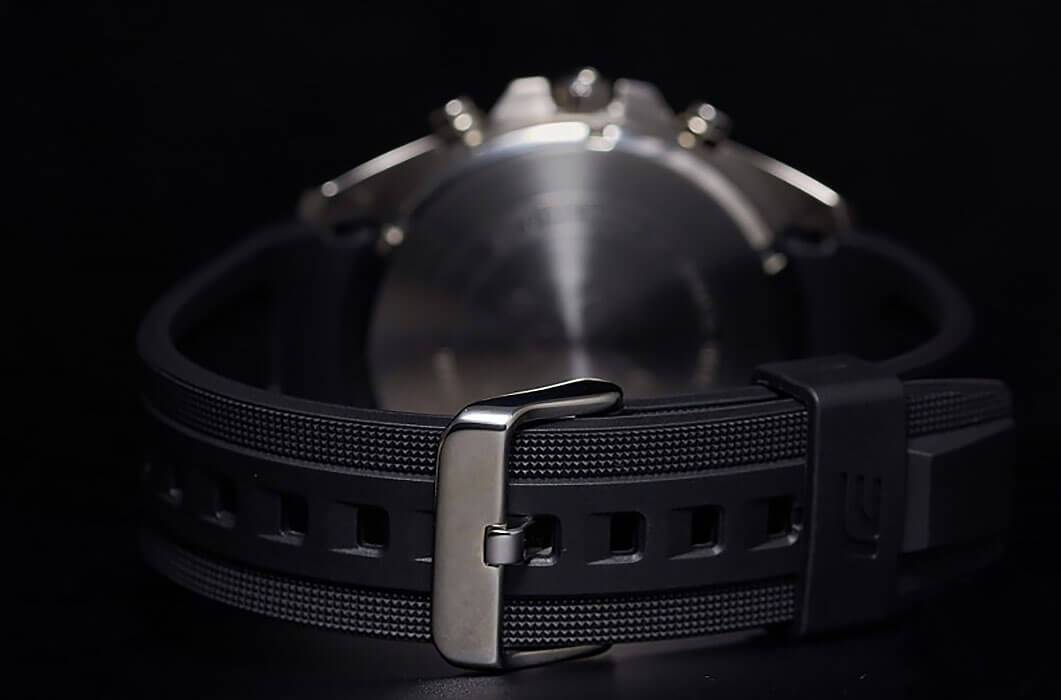 Расположение миниатюрных счётчиков на тёмном циферблате напоминает о приборной панели автомобиля, присутствуют ярко-голубые детали. Надёжный каучуковый ремешок отличается долговечностью и обеспечивает комфортное ношение. Сохраняется водостойкость при давлении 10 бар, чему дополнительно способствует завинчивающаяся задняя крышка. Кварцевый механизм с точностью +/- 20 секунд в месяц. Люминесцентная подсветкаЛюминесцентное покрытиеПозволяет считывать показания времени в темноте. Производители наносят на стрелки, часовые индексы, безель или поверхность циферблата светонакопительный состав, дающий холодное свечение.. Закаленное минеральное стекло. ХронографХронографФункция позволяет измерять отрезки времени с особой точностью: часы, минуты, секунды. Верным признаком хронографа является наличие на циферблате 3 дополнительных окошек-счётчиков., секундомер, отдельное окошко даты. Габариты: 53 x 47 x 12,1 мм.