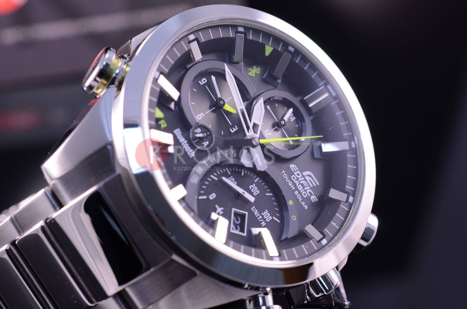 Общее исполнение аксессуара выдержано в автомобильной стилистике, тёмный циферблат отличается оригинальным расположением счётчиков. Наручные часы оснащены технологией BluetoothBluetoothСовременная технология, позволяющая синхронизировать часы с телефоном и переносить данные. Часы с Bluetooth расширяют возможности вашего смартфона и делают его использование ещё более удобным. с низким потреблением энергии, позволяющей часам считывать информацию с интернет-сервера точного времени и обеспечивать абсолютную точность времени. Питание происходит за счёт солнечной батареи - . Водонепроницаемость 100 метров. Минеральное стекло. Люминесцентная подсветкаЛюминесцентное покрытиеПозволяет считывать показания времени в темноте. Производители наносят на стрелки, часовые индексы, безель или поверхность циферблата светонакопительный состав, дающий холодное свечение.. Надёжный стальной браслет. Наличие авиарежима. Функции: уведомление о полученных сообщениях по электронной почте, поиск телефона, отображение числа и дня недели, секундомер, будильник, расчёт средней скорости пройденного маршрута. Габариты: 52 x 48,1 x 14,2 мм.