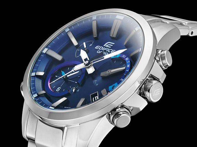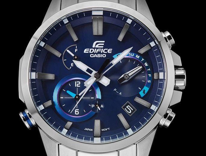 Современные, функциональные наручные кварцевые мужские часы. Круглый корпус выполнены из высокопрочной стали. Синий фон циферблата и стальные элементы дизайна. Водонепроницаемость часов составляет 10 ATM. Сферическое минеральное стекло, устойчивое к появлению царапин. Браслет из прочной нержавеющей стали надежный, прочный и элегантный. Bluetooth, солнечная батарейка, неоновый дисплей, функция мирового времени,  функция секундомера, автоматический календарь.