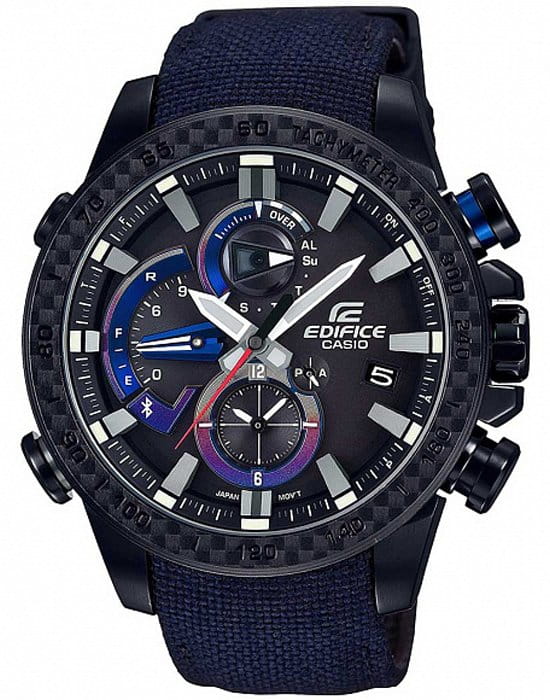 Основным источником дизайнерского воплощения и технических параметров выступает автоспорт Благодаря чему в часах EQB-800 применяется современное конструктивное решение Casio ConnectedEngine, предоставляющее возможность синхронизации с другими устройствами Во внешнем облике явно прослеживается характерный спортивный почерк: