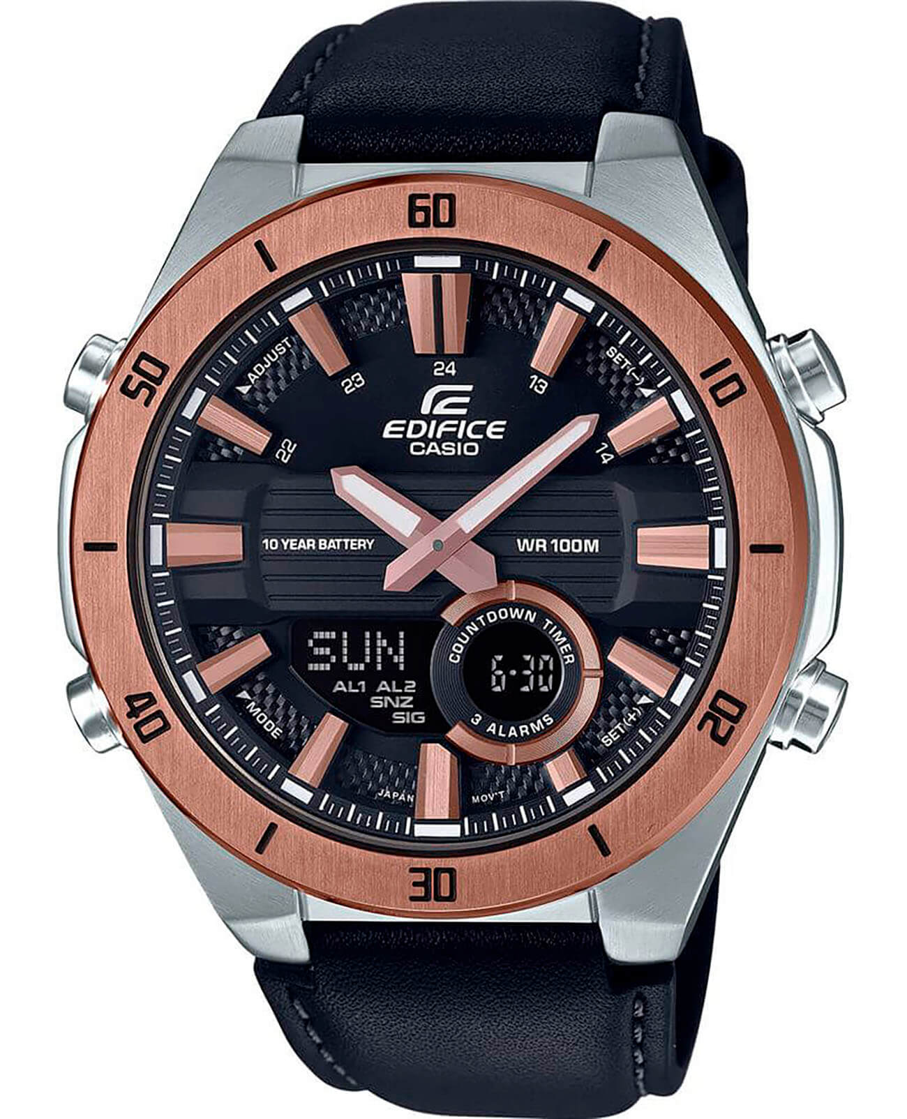 Стильный циферблат в динамичном оформлении имеет крупную индикацию времени, благодаря чему обеспечивается идеальная читаемость показателей в любых условиях. Красиво смотрится блестящий алюминиевый безельБезельВнешний ободок, закрепляющий стекло. В спортивных часах так называется поворотное кольцо с делениями на циферблате, выполняет роль таймера – замеряет отрезки времени на шкале. Неподвижный безель – элемент декора. Однонаправленно вращающийся безель на дайверских часах позволяет фиксировать моменты погружения и выныривания на поверхность.. Наручные часы с кварцевым механизмом работают от батарейки, рекордный эксплуатационный срок которой составит 10 лет. Минеральное стекло. Завинчивающаяся задняя крышка. Люминесцентная подсветкаЛюминесцентное покрытиеПозволяет считывать показания времени в темноте. Производители наносят на стрелки, часовые индексы, безель или поверхность циферблата светонакопительный состав, дающий холодное свечение.. Водостойкость 10 бар. Записная книжка на 30 записей, таймер, будильник, мировое времяМировое время Полезное часовое усложнение, отображающее время в основных городах и известных областях по всему миру, оно связано с часовыми поясами, удобно для путешественников и бизнесменов. , автоматический календарь, секундомер. Габариты: 52 x 47,6 x 14,2 мм.