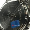 Серебристо-синяя модель наделена элементами дайверского дизайна, повторяя внешний облик механических часов для дайвинга 1950-х годов, в глаза бросается массивный однонаправленно вращающийся безельБезельВнешний ободок, закрепляющий стекло. В спортивных часах так называется поворотное кольцо с делениями на циферблате, выполняет роль таймера – замеряет отрезки времени на шкале. Неподвижный безель – элемент декора. Однонаправленно вращающийся безель на дайверских часах позволяет фиксировать моменты погружения и выныривания на поверхность. с фигурным краем, крупные стрелки и часовые индексы. Секундная стрелка дополнена красным наконечником, что обеспечивает превосходную читаемость показаний с циферблата. Кварцевый японский механизм с точностью хода часов +/- 20 секунд в месяц. Батарейка рассчитана на 3 года работы. Люминесцентная подсветка NeobriteПодсветка NeobriteИспользование светонакопительных составов на основе сульфида цинка или алюмината стронция, яркий свет можно наблюдать на протяжении 6-10 часов после «зарядки» часов около источника света.. Водонепроницаемость при давлении до 10 бар. Ударопрочный корпусУдаропрочный корпусМеханизм заключён в корпус, выполненный из современных материалов, устойчивых к ударам, механическим повреждениям и падению с высоты: инновационный пластик, карбон, нержавеющая сталь, титан. и браслет из нержавеющей стали 316L. Цветное IP-покрытиеIP-покрытиеМетод ионного напыления. Демонстрирует повышенную устойчивость к истиранию, окислению и химическим веществам. Под воздействием высокого давления и температуры около 1500°C молекулы металла надёжно соединяются с частицами корпуса часов.. Минеральное стекло. Окошко индикации числа. Габариты: 42 x 37,8 x 9,4 мм.