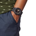 Золотистые с розовым отливом элементы циферблата отлично смотрятся на тёмном фоне. Массивная модель с крупными деталями – идеальный вариант для широкого мужского запястья, а их спортивный стиль можно интересно обыграть с большинством образов. Наручные часы обладают ударопрочной конструкцией корпусаУдаропрочный корпусМеханизм заключён в корпус, выполненный из современных материалов, устойчивых к ударам, механическим повреждениям и падению с высоты: инновационный пластик, карбон, нержавеющая сталь, титан., выполненного из пластика. Благодаря этому японский кварцевый механизм находится под повышенной защитой от повреждений. Срок службы батарейки составляет 2 года. Устойчивость к воздействию магнитных полей. Циферблат со светодиодной подсветкойСветодиодная подсветкаСветодиодная или LED-подсветка обеспечивает появление яркого холодного свечения за счёт LED-элементов - маленьких лампочек. Они потребляют минимальное количество энергии, чаще всего можно встретить 1 светодиод, в нижней части циферблата.. Минеральное стекло. Водонепроницаемость 20 бар. Дополнительные возможности: расчёт средней скорости заданного маршрута, хронографХронографФункция позволяет измерять отрезки времени с особой точностью: часы, минуты, секунды. Верным признаком хронографа является наличие на циферблате 3 дополнительных окошек-счётчиков., секундомер, автоматический календарь до 2099 года, мировое времяМировое время Полезное часовое усложнение, отображающее время в основных городах и известных областях по всему миру, оно связано с часовыми поясами, удобно для путешественников и бизнесменов. , 5 будильников, таймер обратного отсчёта. Габариты: 55 x 51,2 x 16,9 мм.