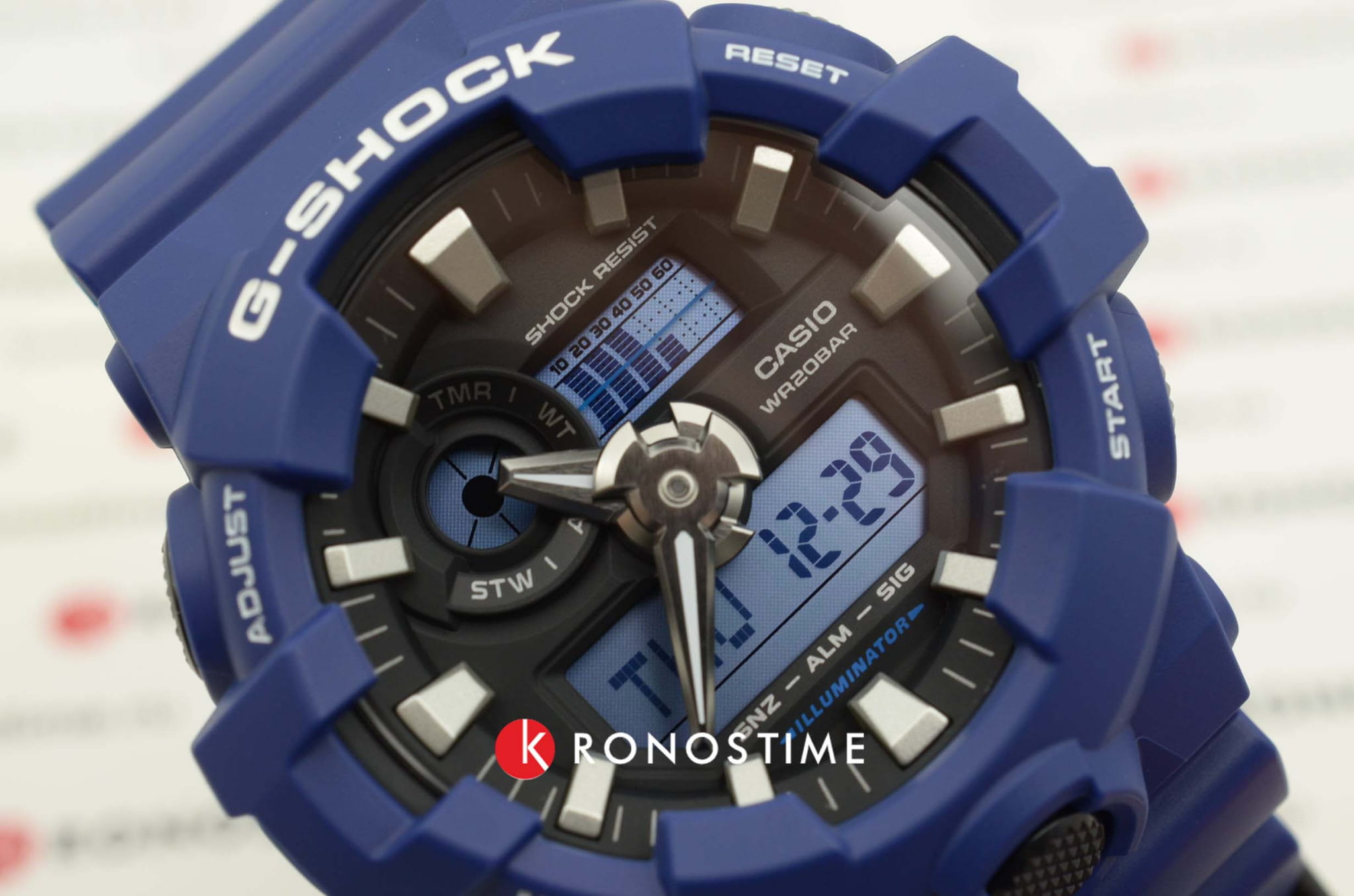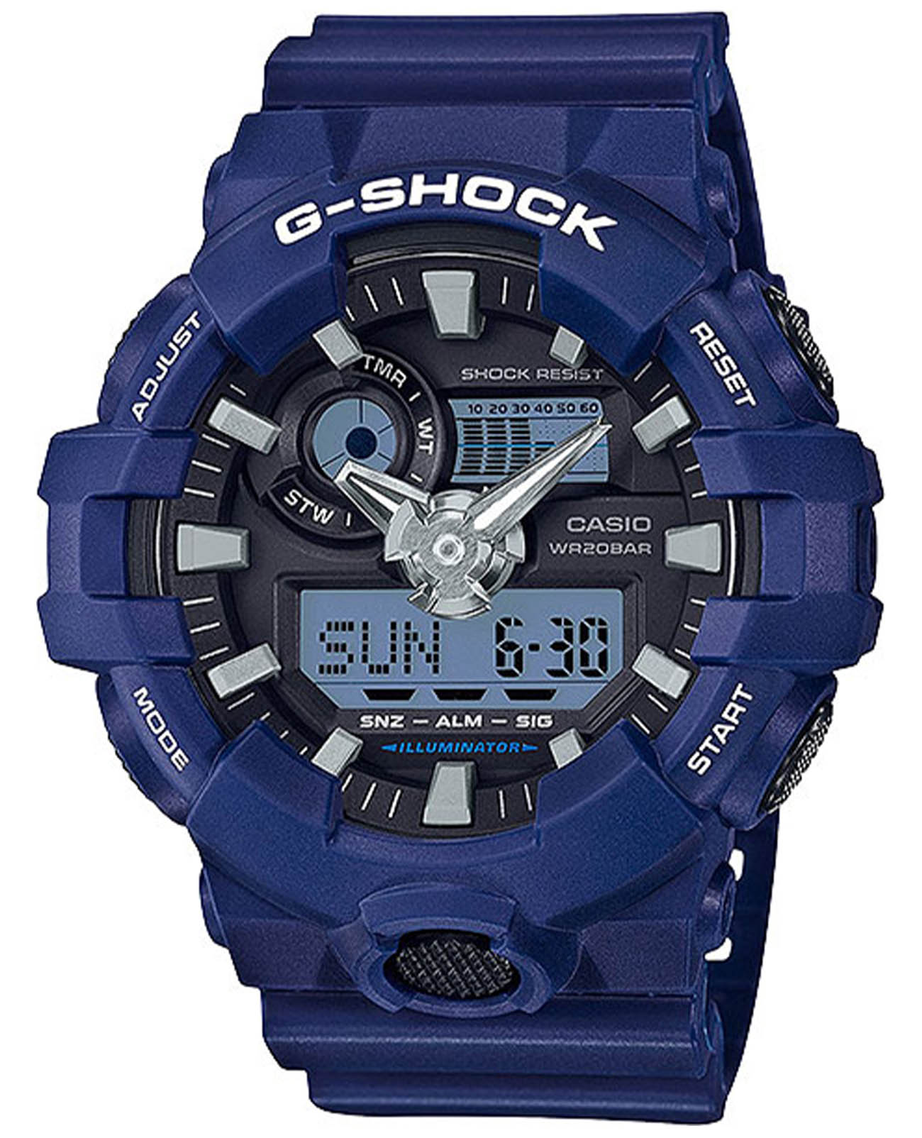 Японские мужские часы Casio G-Shock GA-700-2A из линейки G-Shock - результат воплощения современных технологий и привлекательного дизайна. Аналого-цифровые часы имеют ярко-синее исполнение, циферблат дополнен контрастными элементами, аксессуар является выгодным завершением образа. Модель имеет противоударный корпусУдаропрочный корпусМеханизм заключён в корпус, выполненный из современных материалов, устойчивых к ударам, механическим повреждениям и падению с высоты: инновационный пластик, карбон, нержавеющая сталь, титан. из полимерного пластика, устойчивого к максимальным нагрузкам. Японский кварцевый механизм. Аккумулятор рассчитан на 5 лет работы. Включение и отключение звука кнопок. Светодиодная LED-подсветкаСветодиодная подсветкаСветодиодная или LED-подсветка обеспечивает появление яркого холодного свечения за счёт LED-элементов - маленьких лампочек. Они потребляют минимальное количество энергии, чаще всего можно встретить 1 светодиод, в нижней части циферблата., кнопка активации для удобства вынесена в нижнюю часть. Водозащита 200 метров. Минеральное стеклоМинеральное стеклоМинеральное стекло представляет собой искусственно выращенный минерал кварца. Такое стекло отличается особой устойчивостью к повреждениям и царапинам. Уступает по некоторым качествам сапфировому стеклу.. Функция мирового времениМировое время Полезное часовое усложнение, отображающее время в основных городах и известных областях по всему миру, оно связано с часовыми поясами, удобно для путешественников и бизнесменов. , таймерТаймерОтсчитывает секунды в обратном направлении в заданном интервале времени. с автоповтором, UTCUTCВсемирное кординационное время, не имеющее привязки к географическому положению Гринвича, основывается на атомном отсчёте времени. Регулировка времени осуществляется более точно, чем устаревшее GMT.