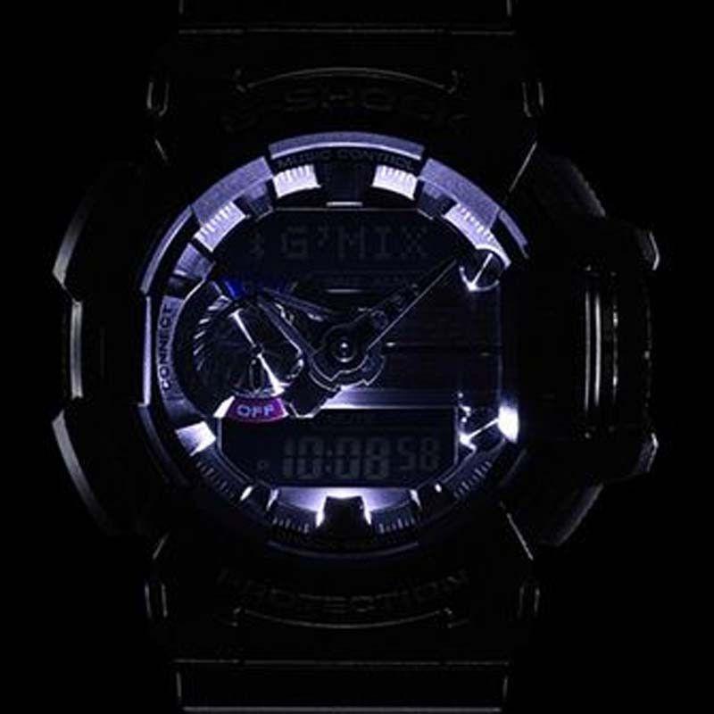 G-Shock Bluetooth G'MIX. Циферблат подсвечивается ярким светодиодом. Ударопрочная конструкция защищает механизм от ударов и вибрации. Индикатор низкого заряда батареи. Синхронизация с iPhone 4s, 5, 5c, 5s, 6, 6 Plus, Samsung Galaxy Note 3, Samsung Galaxy S4, S5 и др. Уведомление о входящих вызовах и сообщениях электронной почты звуковым сигналом или вибрацией. Автоматическая регулировка времени в соответствии с настройками смартфона. Управление воспроизведением музыкальных композиций в приложении G’MIX. Регулировка эффектов звучания музыки. Определение названия и исполнителя музыки, благодаря сервису SoundHound.