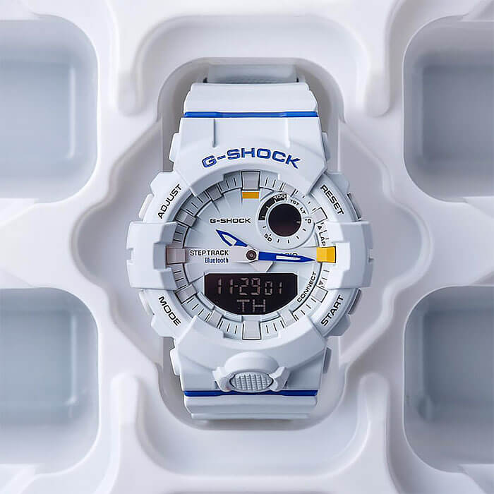 Японские мужские часы GBA-800DG-7AER из коллекции G-Shock станут ключевой особенностью вашего образа благодаря запоминающемуся внешнему виду с синими и оранжевыми деталями.