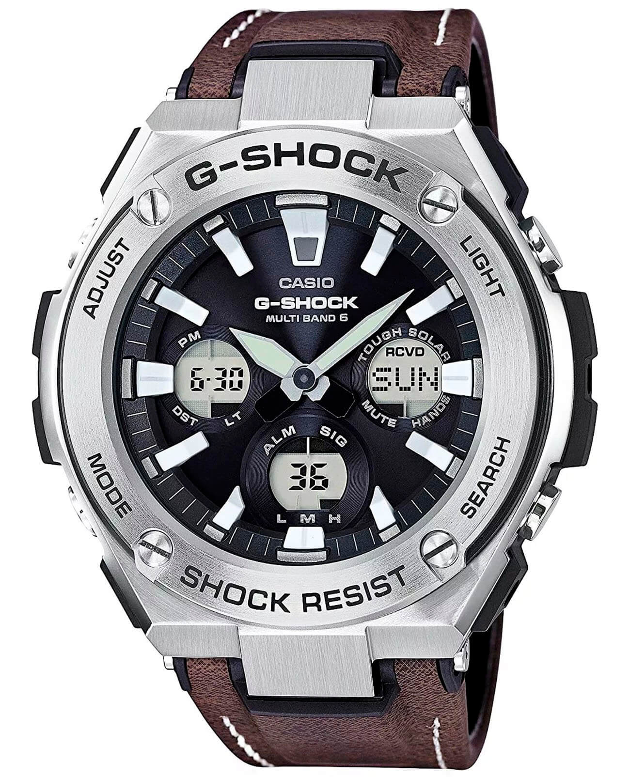 Тёмный циферблат имеет крупную индикацию времени, что обеспечивает отличную читаемость показателей даже при беглом взгляде. Особенностью аксессуара стал ремешок из инновационного материала Tough Leather, разработанный инженерами Casio. Он имеет сходство с кожей, но обладает большей прочностью и устойчивостью к износу. Наручные часы могут похвастаться ударопрочным корпусомУдаропрочный корпусМеханизм заключён в корпус, выполненный из современных материалов, устойчивых к ударам, механическим повреждениям и падению с высоты: инновационный пластик, карбон, нержавеющая сталь, титан. из стали и пластика, выдерживающим любые нагрузки. Они не нуждаются в заводе благодаря технологии питания от солнечного света . Закаленное минеральное стекло. Водозащита 200 метров. Уведомление звуковым сигналом о наступлении каждого часа. Автоматическая светодиодная подсветкаСветодиодная подсветкаСветодиодная или LED-подсветка обеспечивает появление яркого холодного свечения за счёт LED-элементов - маленьких лампочек. Они потребляют минимальное количество энергии, чаще всего можно встретить 1 светодиод, в нижней части циферблата.. Секундомер, 5 будильников, мировое времяМировое время Полезное часовое усложнение, отображающее время в основных городах и известных областях по всему миру, оно связано с часовыми поясами, удобно для путешественников и бизнесменов. , таймер, хронографХронографФункция позволяет измерять отрезки времени с особой точностью: часы, минуты, секунды. Верным признаком хронографа является наличие на циферблате 3 дополнительных окошек-счётчиков., календарь, UTCUTCВсемирное кординационное время, не имеющее привязки к географическому положению Гринвича, основывается на атомном отсчёте времени. Регулировка времени осуществляется более точно, чем устаревшее GMT.