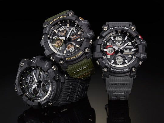 Наручные часы относятся к линейке Mudmaster, массивная модель с крупными деталями на вашем запястье точно не останется незамеченной. Ключевой особенностью стал герметичный ударопрочный корпусУдаропрочный корпусМеханизм заключён в корпус, выполненный из современных материалов, устойчивых к ударам, механическим повреждениям и падению с высоты: инновационный пластик, карбон, нержавеющая сталь, титан., способный препятствовать попаданию внутрь пыли, песка и грязи. Также ему не страшны вибрации, падение и удары. Это часы на солнечной батарее с технологией , время работы аккумулятора без подзарядки составляет 7 месяцев. Специальный индикатор позволяет следить за уровнем зарядки. Минеральное стекло. Двойная светодиодная подсветкаСветодиодная подсветкаСветодиодная или LED-подсветка обеспечивает появление яркого холодного свечения за счёт LED-элементов - маленьких лампочек. Они потребляют минимальное количество энергии, чаще всего можно встретить 1 светодиод, в нижней части циферблата. ЖК-дисплея и циферблата. Удобный полимерный ремешок. Стрелки с люминесцентной подсветкойЛюминесцентное покрытиеПозволяет считывать показания времени в темноте. Производители наносят на стрелки, часовые индексы, безель или поверхность циферблата светонакопительный состав, дающий холодное свечение.. Водостойкость 20 бар. Коррекция времени по радиосигналу, функция мирового времениМировое время Полезное часовое усложнение, отображающее время в основных городах и известных областях по всему миру, оно связано с часовыми поясами, удобно для путешественников и бизнесменов. , автоматический календарь, будильник, таймер, секундомер. Габариты: 56,2 x 54,9 x 17,3 мм.