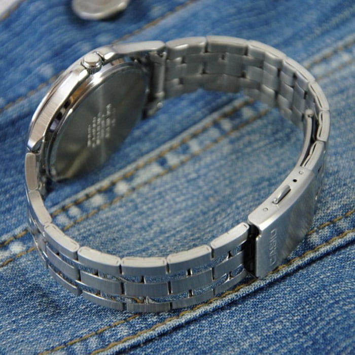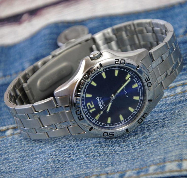 Данная модель от Casio придется по вкусу ценителям высокого качества, комфорта и стильного дизайна. Корпус выполнен из латуни. Стальной браслет прочно обхватывает запястье и закрепляется с помощью раскладывающейся застежки. Синий циферблат традиционной формы обрамляет аккуратный безельБезельВнешний ободок, закрепляющий стекло. В спортивных часах так называется поворотное кольцо с делениями на циферблате, выполняет роль таймера – замеряет отрезки времени на шкале. Неподвижный безель – элемент декора. Однонаправленно вращающийся безель на дайверских часах позволяет фиксировать моменты погружения и выныривания на поверхность.. Крупные отчетливые временные отметки выполнены в виде штрихов и арабских цифр. Подсветка NeobriteПодсветка NeobriteИспользование светонакопительных составов на основе сульфида цинка или алюмината стронция, яркий свет можно наблюдать на протяжении 6-10 часов после «зарядки» часов около источника света. обеспечивает видимость показателей в темное время суток. Тип механизма - кварцевый. Вес составляет 105 грамм.