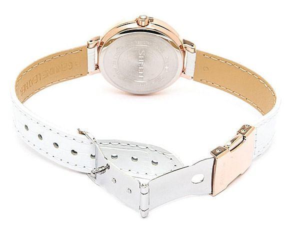Стильные женские наручные часы, выполненные в fashion стиле. Кварцевые часы с элементом питания SR920SW. Корпус часов выполнен из высокопрочной стали с полным IP покрытием золотого цвета. Золотые индексы и стрелки на светлом циферблате. Водонепроницаемость часов 50 метров, минеральное стекло, устойчивое к царапинам. Украшены часы кристаллами Swarovski.  Ремешок из натуральной кожи белого цвета прочно удерживает часы на руке.